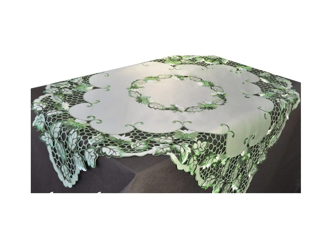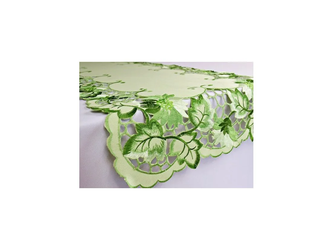 Elegancki haftowany obrus w rozmiarze 120x160 cm w kolorze zielonym. Obrus w kształcie prostokątnym został wykonany z tkaniny 100 % poliestrowej.