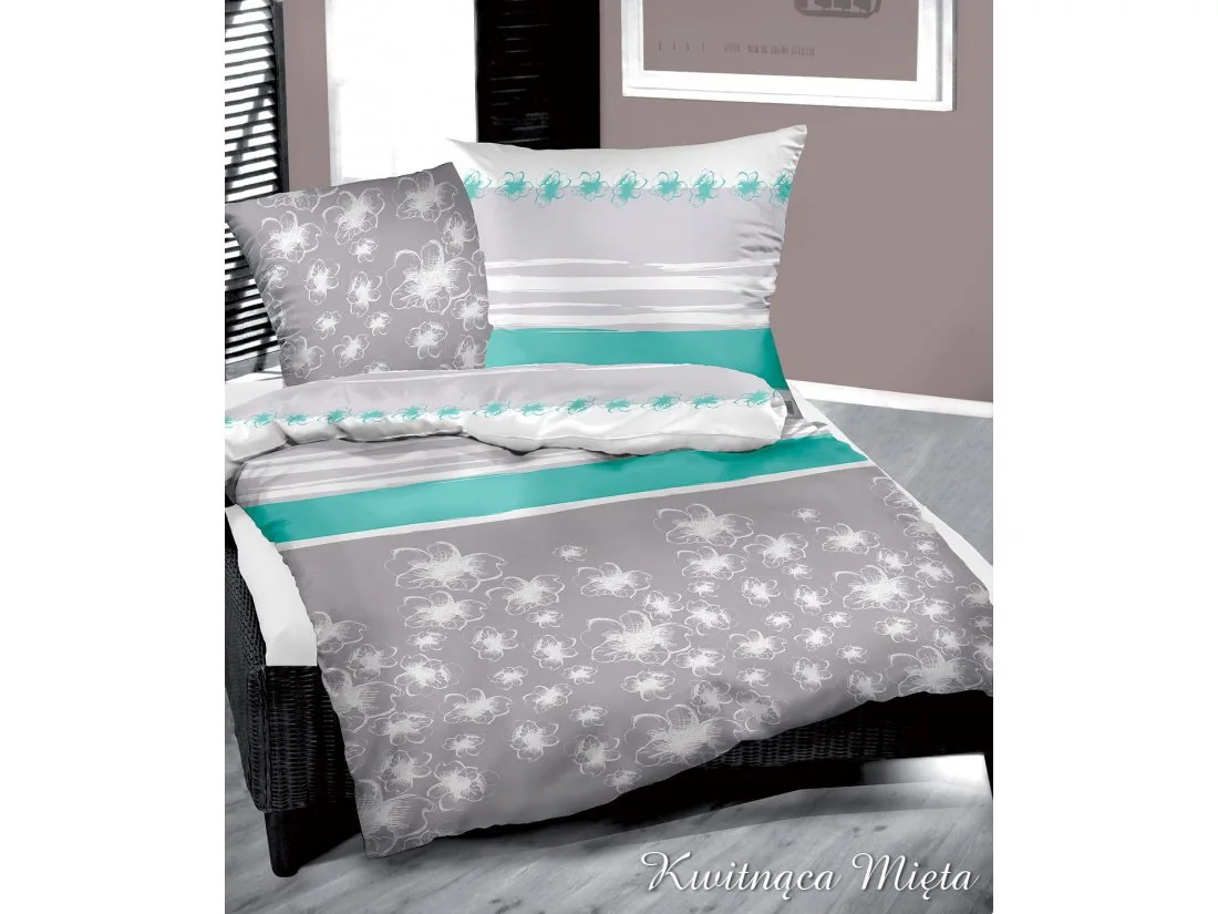 Pościel flanelowa 160x200 cm polskiej firmy Greno wzór Kwitnąca Mięta w ciekawej szaro miętowej kolorystyce z modnym kwiatowym wzorem.