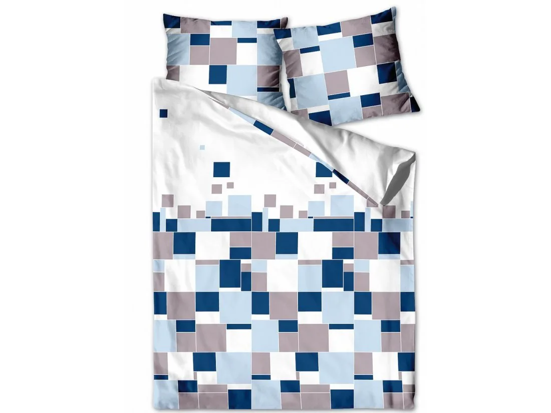 Fantazyjny geometryczny wzór pościeli satynowej znakomicie wkomponowany w niebiesko granatowo szarą kolorystykę intryguje oraz przyciąga wzrok.
