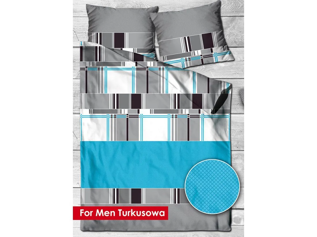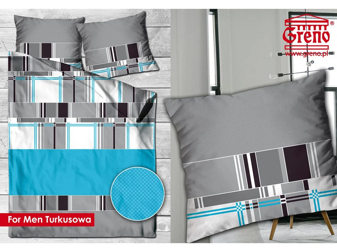 Pościel z satyny bawełnianej 220x200 model For Men Turkusowa polskiej firmy Greno z kolekcji Gold Line to nowa propozycja bielizny pościelowej. Wzór zachwyci wszystkich lubiących w swojej sypialni modne geometryczne wzory.