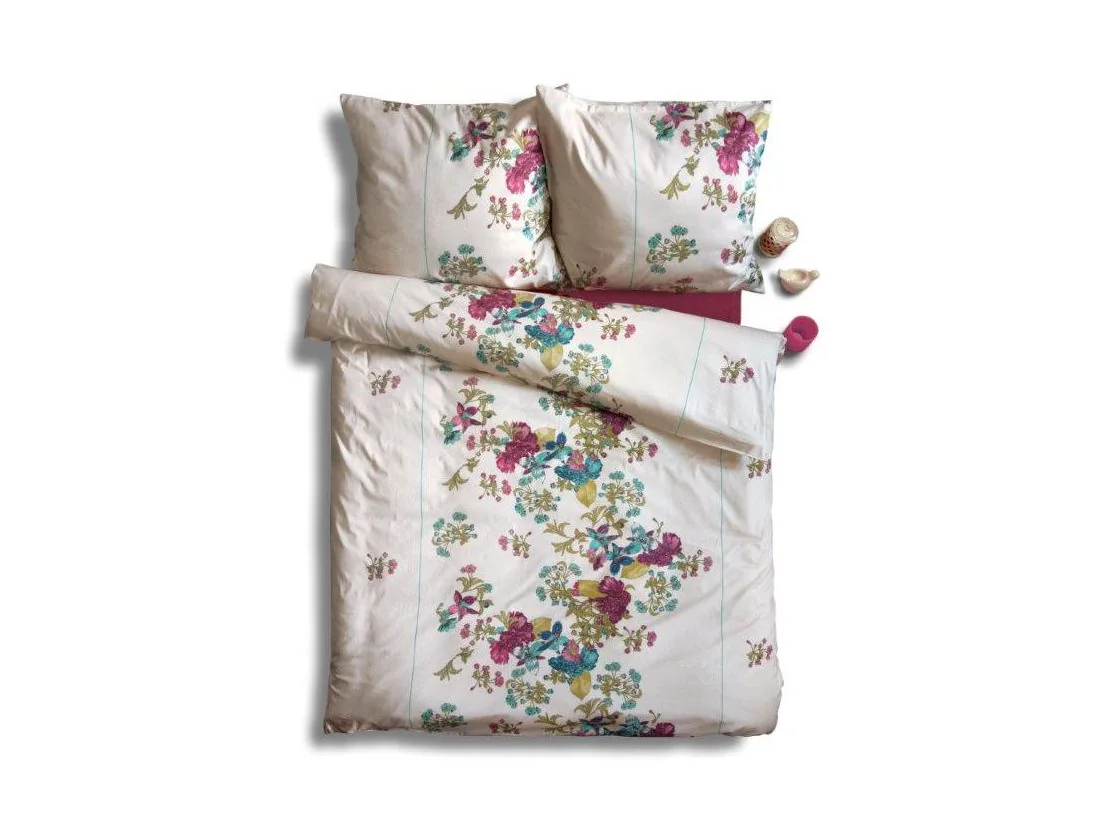Delikatny kwiatowy wzór połączony z nietuzinkowym zestawem kolorów kremowym fioletowo wrzosowym to wyjście z monotonii oraz obiekt pożądania wszystkich ceniących luksus i elegancja w swojej sypialni.