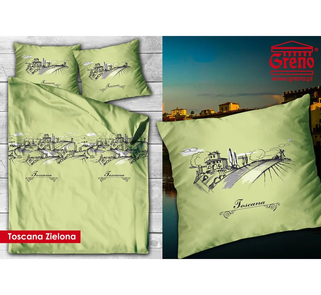 Pościel z satyny bawełnianej 160x200 model Toscana Zielona polskiej firmy Greno z kolekcji Gold Line to nowa propozycja bielizny pościelowej. Wzór Toscana zachwyci wszystkich lubiących w swojej sypialni niebanalne aranżacje.