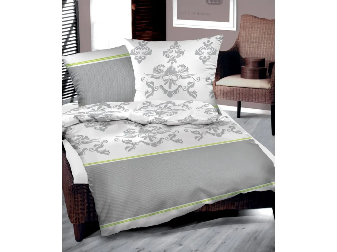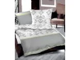 Klasyczny barokowy wzór pościeli satynowej znakomicie wkomponowany w ciepłą kolorystykę biało szarą z delikatnymi wstawkami w kolorze limonki intryguje oraz przyciąga wzrok.