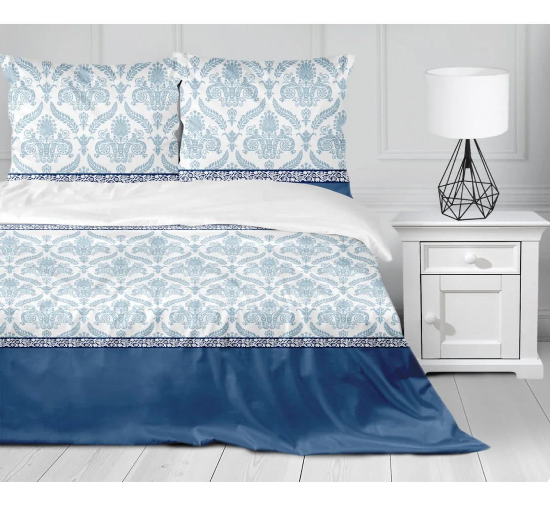 Modny wzór pościeli satynowej znakomicie wkomponowany w modną kolorystykę biało niebiesko granatowa z fantazyjnym wzorem intryguje oraz przyciąga wzrok. Stylistyka pościeli Gold Line to połączenie tradycji z nowoczesnością tworząca niezwykłą elegancką kompozycje która nada niecodzienny charakter oraz wyjątkowy urok każdej sypialni.