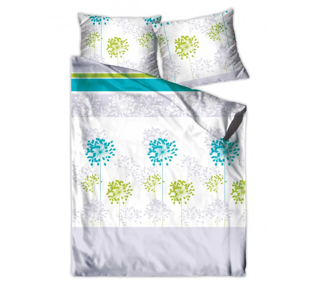 Dmuchawce, latawce, wiatr to delikatny lekki wzór pościeli satynowej znakomicie wkomponowany w ciekawą kolorystykę biało szarą z fantazyjnym wzorem w kolorze turkusu, zieleni, szarości intryguje oraz przyciąga wzrok.