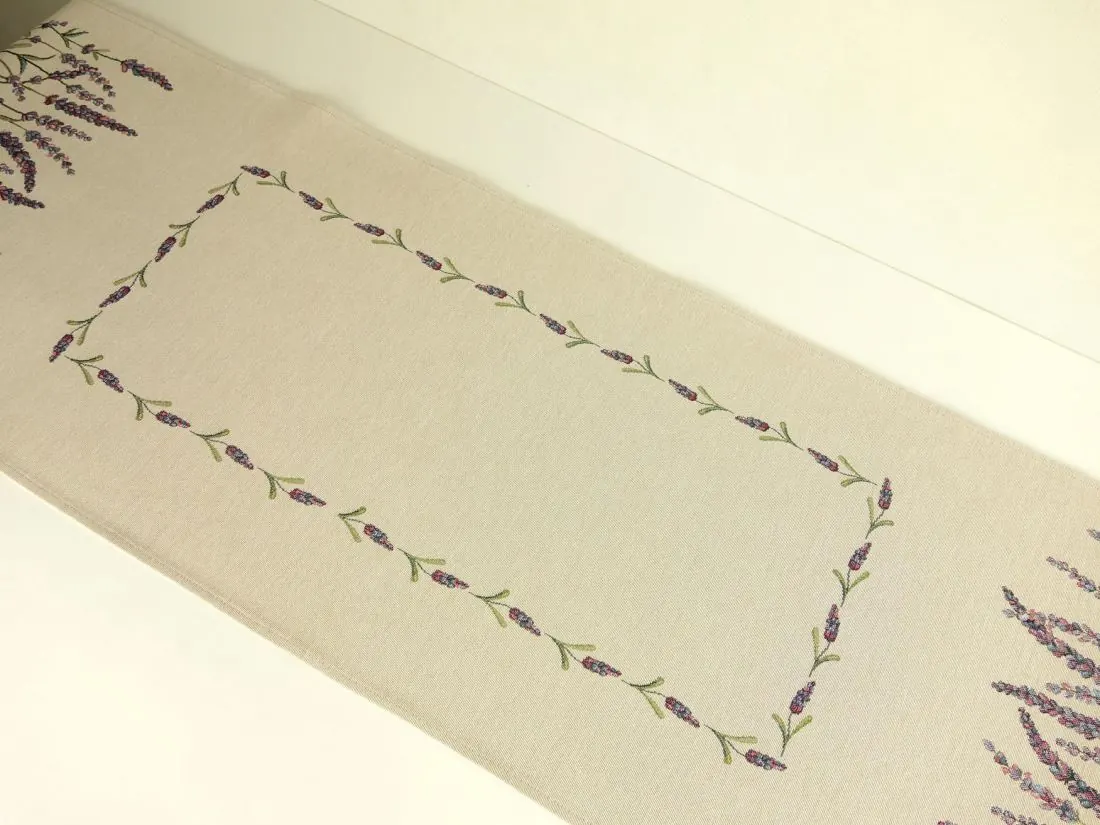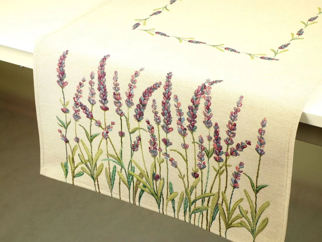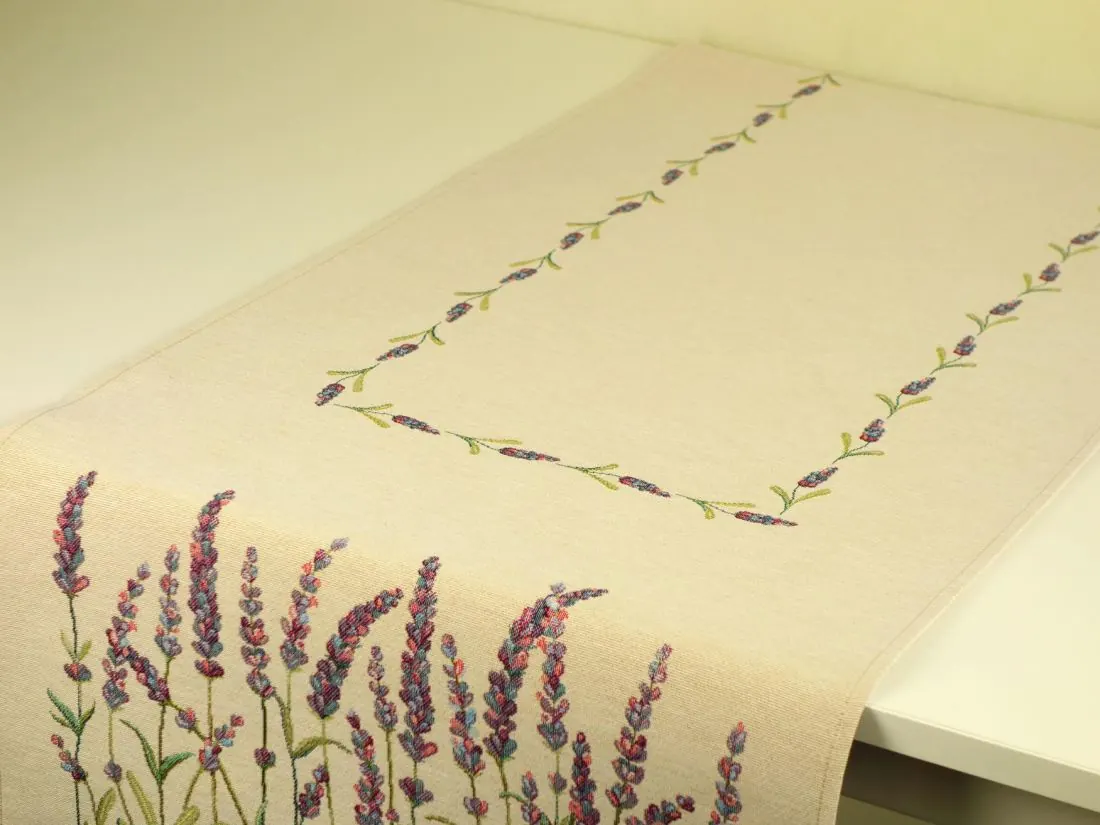 Dekoracyjny bieżnik gobelinowy w rozmiarze 40x100 cm, został wykonany z tkaniny hiszpańskiej 25% bawełna, 70 % poliester, 5% poliakryl - tkanina tkana żakardowa z kwiatowym wzorem idealnie podkreśli klimat każdej kuchni idealnie wkomponuje się w aranżacje salonu. Nakładka w kształcie prostokątnym na środku której rozmieszczony jest wzór kwiatowy, na krótszym boku dekoracyjny lawendowy wzór nadający niepowtarzalny urok nakładki.Niepowtarzalne wzornictwo gobelinu podkreśli wystrój każdego wnętrza gdzie bieżnik zostanie rozłożony. Jest to niezastąpiony element do salonu, kuchni, który może odmienić każde wnętrze oraz magicznie podkreślić jego wystrój. Wzornictwo nawiązuje do tradycyjnych gobelinów które dawniej zdobiły ściany w domach. Zastosowana tkanina jest tkana, gruba, nie gniecie. Różnorodność wzorów gobelinowych zadowoli każdego kto pragnie aby w jego pomieszczeniu zagościł niepowtarzalny magiczny sielski klimat. Nakładka gobelinowa może być idealnym rozwiązaniem aby odmienić wnętrze jak również niezastąpionym pomysłem na prezent dla bliskiej osoby.