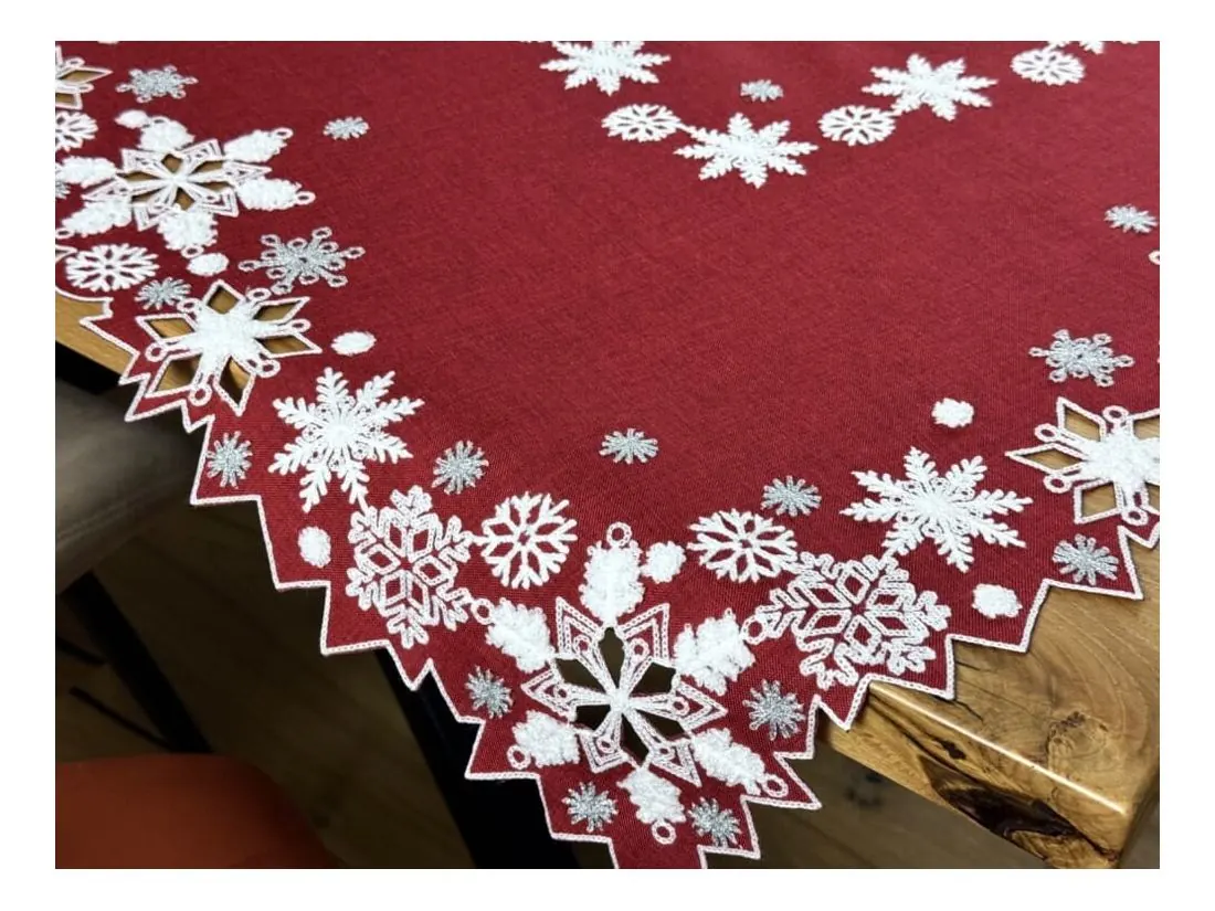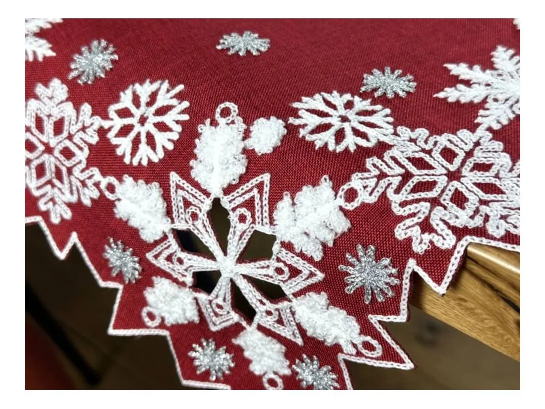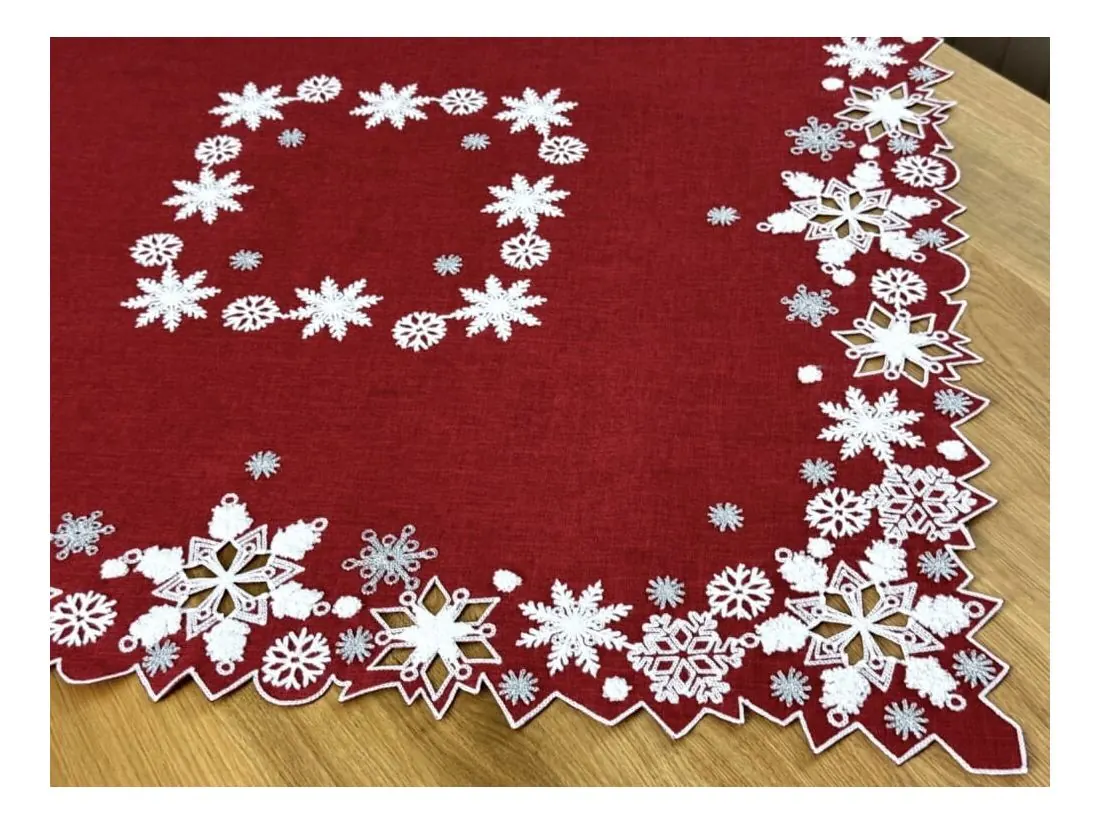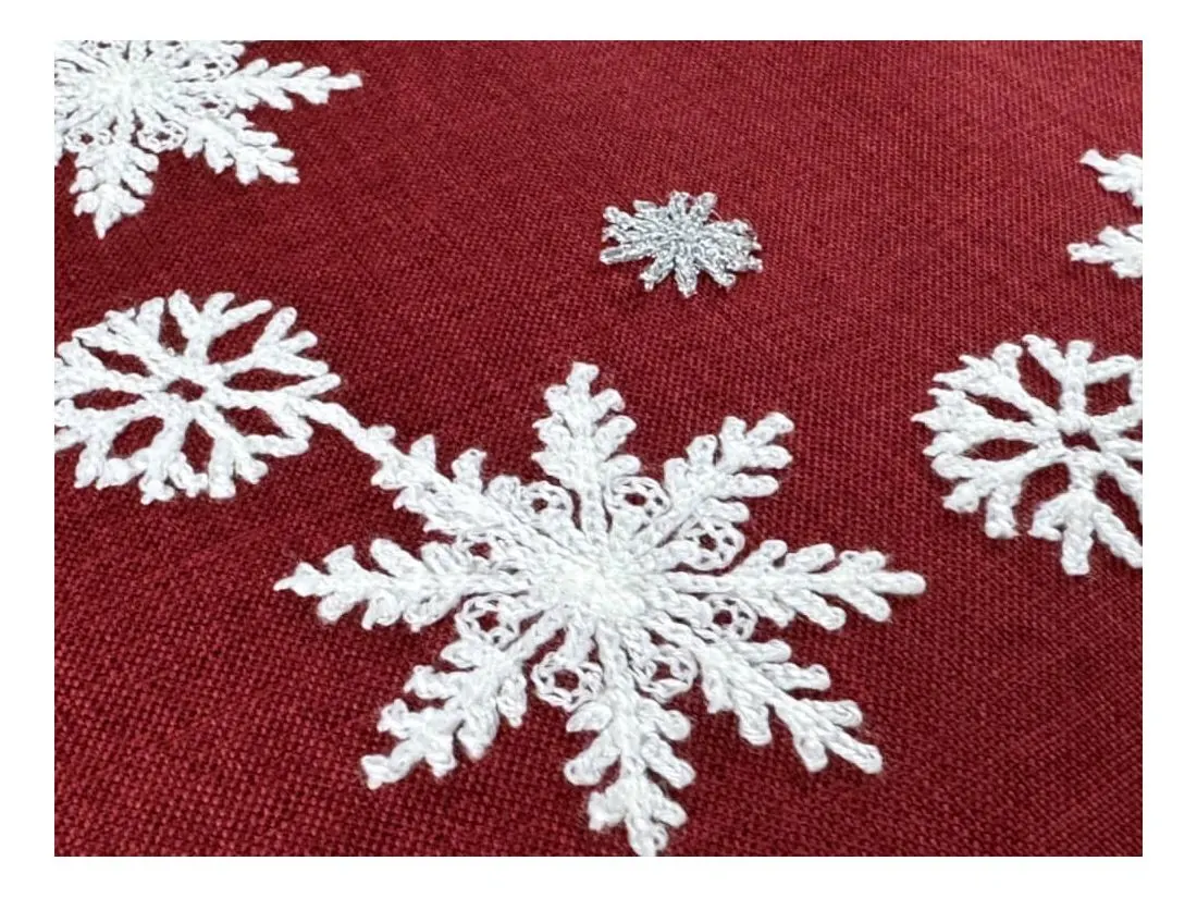 Nakładkę zdobią subtelne, białe śnieżynki wykonane techniką haftu, które w piękny sposób symbolizują radosny czas świąteczny. Misternie haftowane śnieżynki tworzą elegancki wzór, wprowadzając do wnętrza atmosferę zimowej krainy.