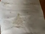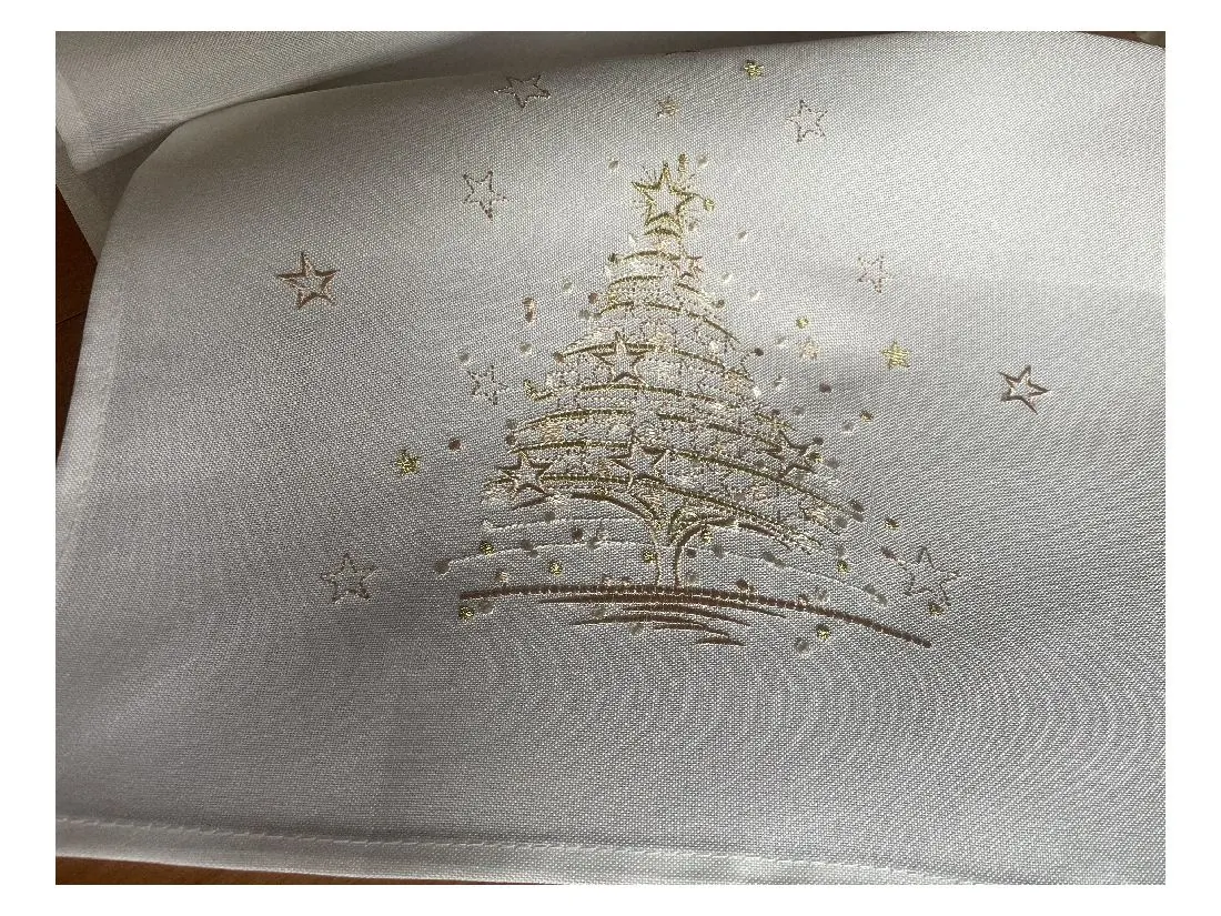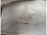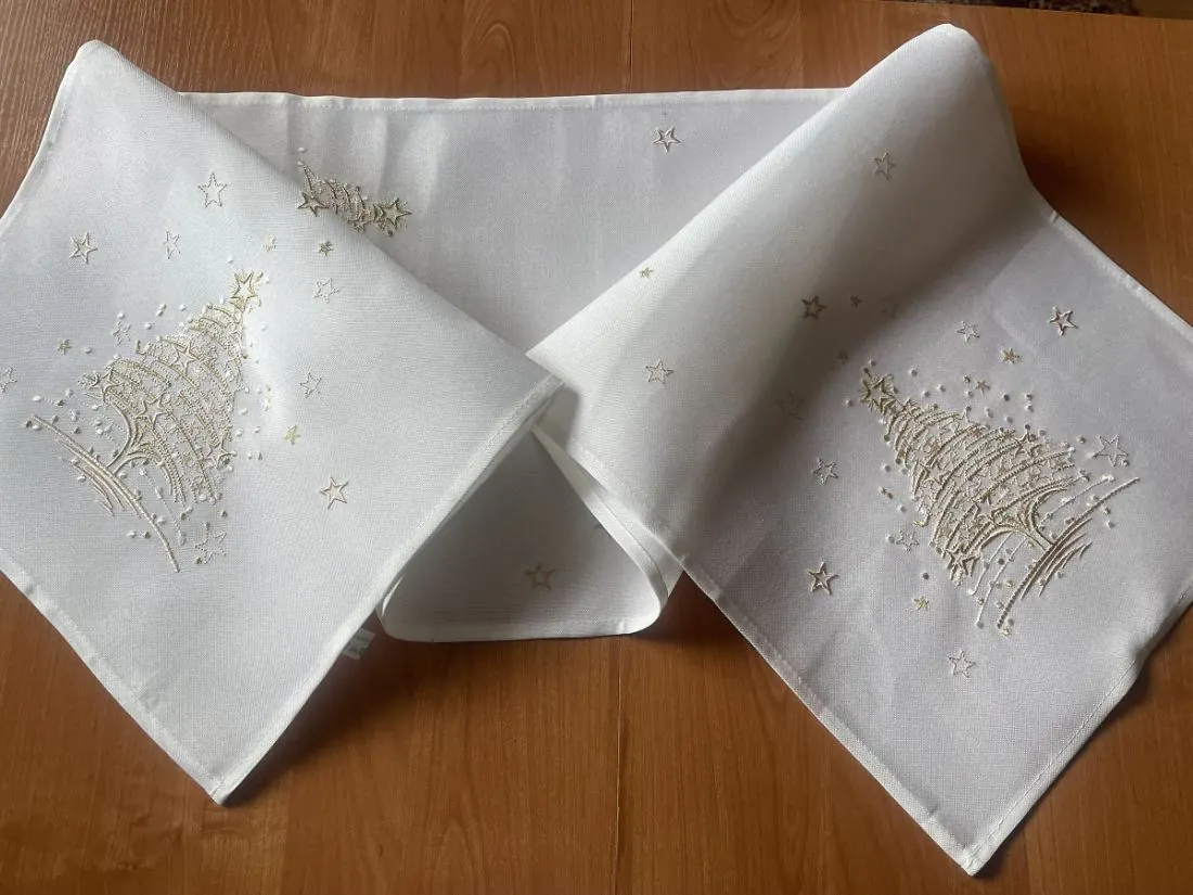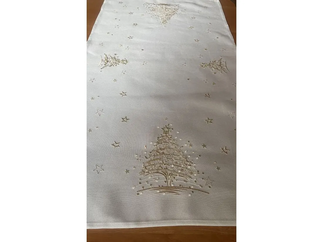 Bieżnik świąteczny w rozmiarze 50x100 cm w kolorze białym z bogato zdobioną aplikacją złotej choinki w otoczeniu gwiazdek została wykonana na tkaninie 100 % poliestrowej, charakteryzuje się nowoczesnym designem, świątecznym wzorem oraz modnym kolorem.