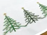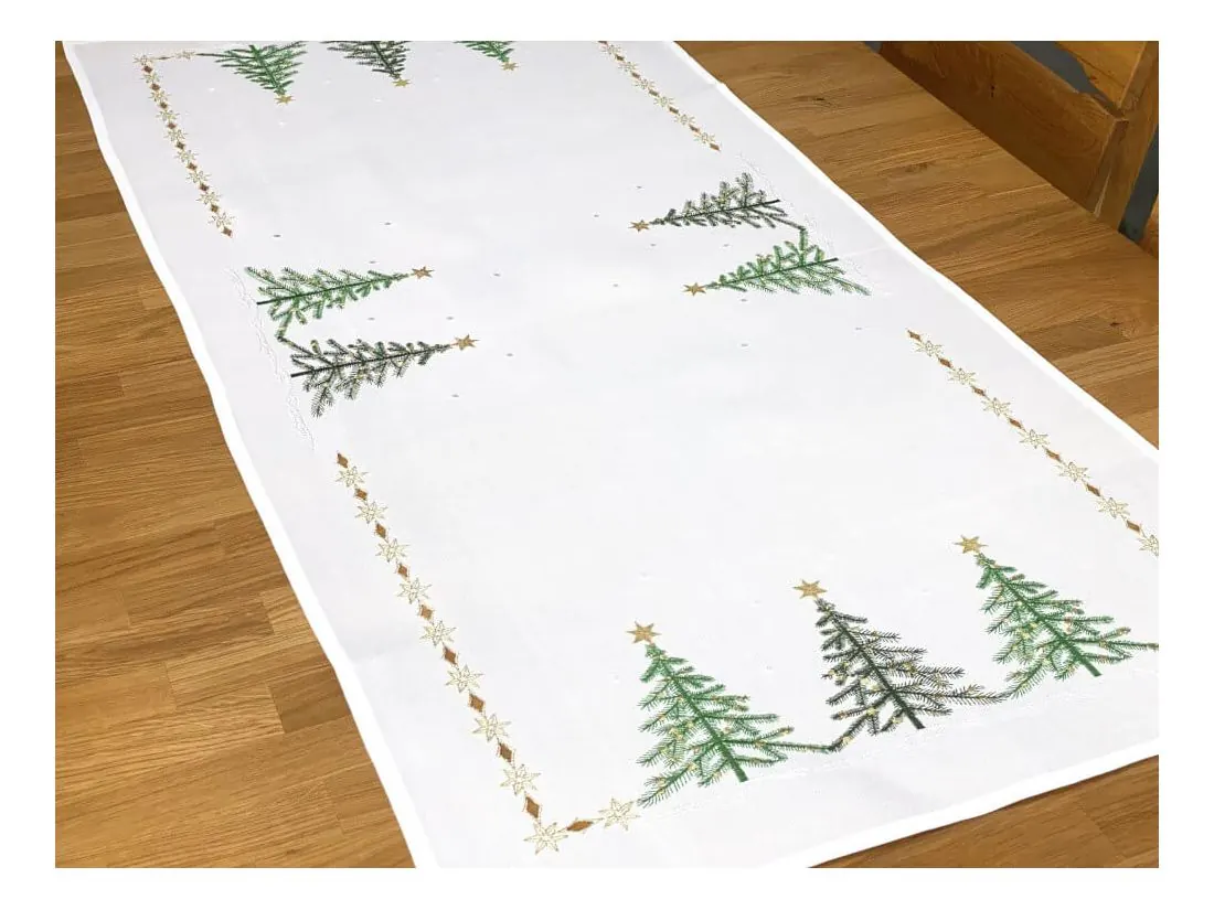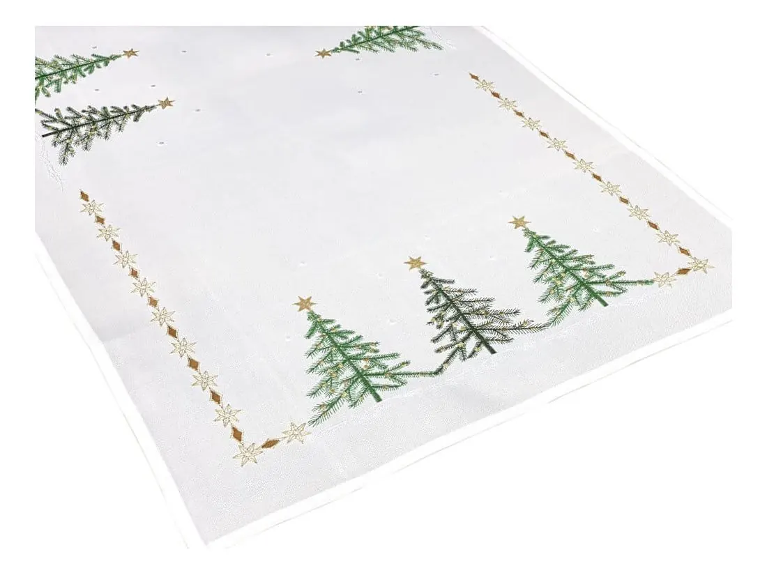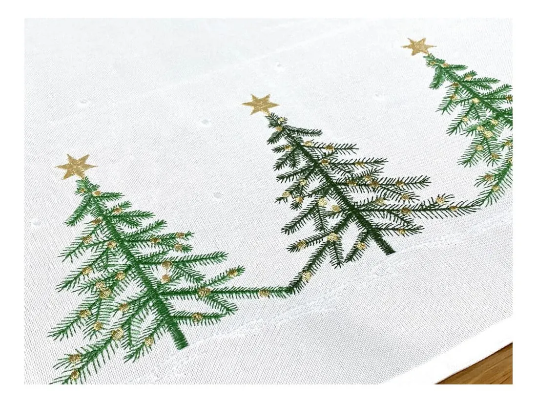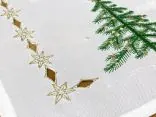 Bieżnik świąteczny w rozmiarze 55x115 cm w kolorze białym z bogato zdobioną aplikacją zielonych choinek w otoczeniu złotych gwiazdek, została wykonana na tkaninie 100 % poliestrowej, charakteryzuje się nowoczesnym designem, świątecznym wzorem oraz modnym kolorem. Dodatkową ozdobą nakładki są wycięcia wzdłuż bieżnika w formie złotego łańcuszka z magicznych gwiazdek