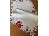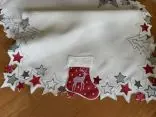 Nakładka świąteczna w rozmiarze 60x120 cm w kolorze białym , z bogato zdobioną aplikacja świąteczną choinki, renifera, gwiazdek została wykonana na tkaninie 100 % poliestrowej, charakteryzuje się nowoczesnym designem, świątecznym wzorem oraz modnym kolorem.