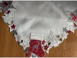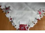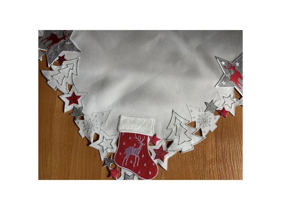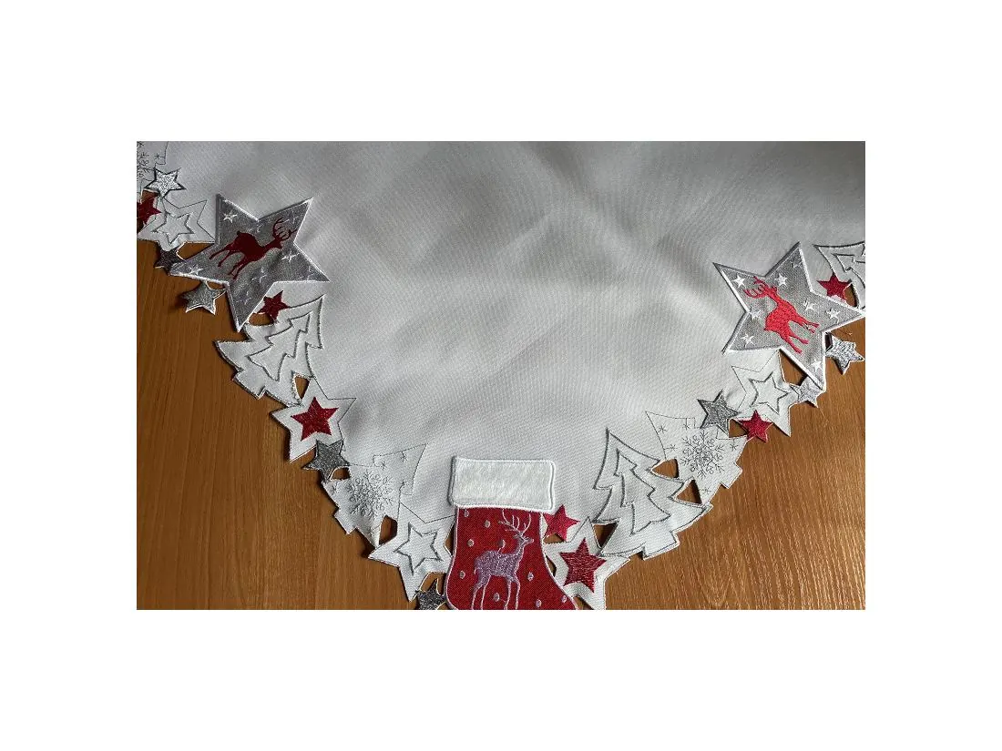 Nakładka świąteczna w rozmiarze 85x85 cm w kolorze białym , z bogato zdobioną aplikacja świąteczną choinki, renifera, gwiazdek została wykonana na tkaninie 100 % poliestrowej, charakteryzuje się nowoczesnym designem, świątecznym wzorem oraz modnym kolorem.