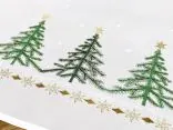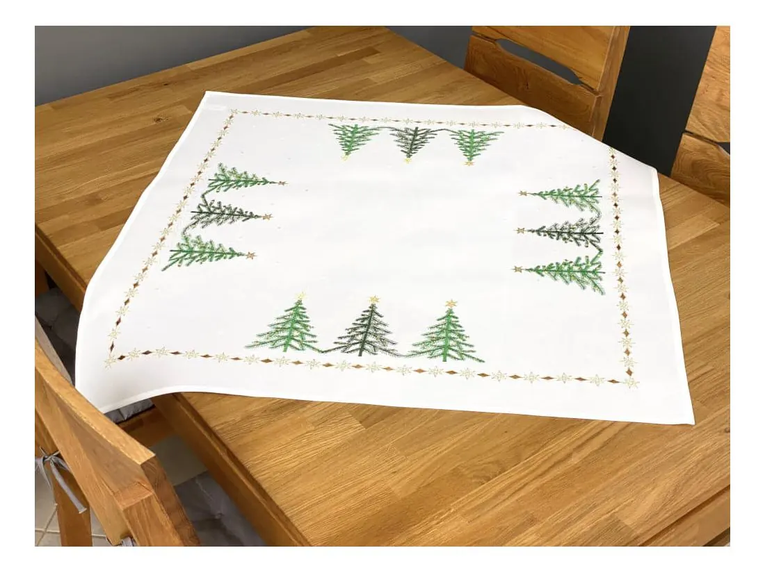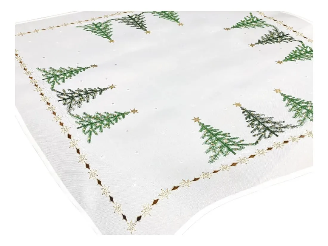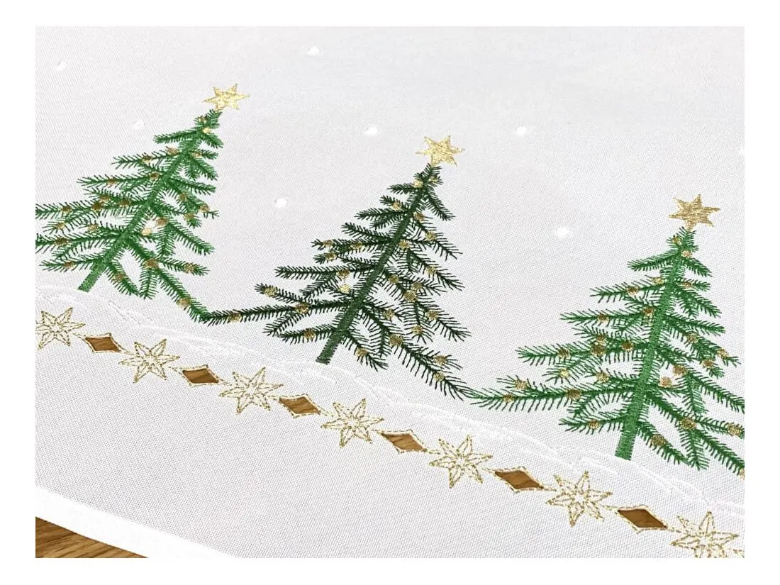 Bieżnik świąteczny w rozmiarze 85x85 cm w kolorze białym z bogato zdobioną aplikacją zielonych choinek w otoczeniu złotych gwiazdek, została wykonana na tkaninie 100 % poliestrowej, charakteryzuje się nowoczesnym designem, świątecznym wzorem oraz modnym kolorem. Dodatkową ozdobą nakładki są wycięcia wzdłuż bieżnika w formie złotego łańcuszka z magicznych gwiazdek