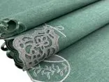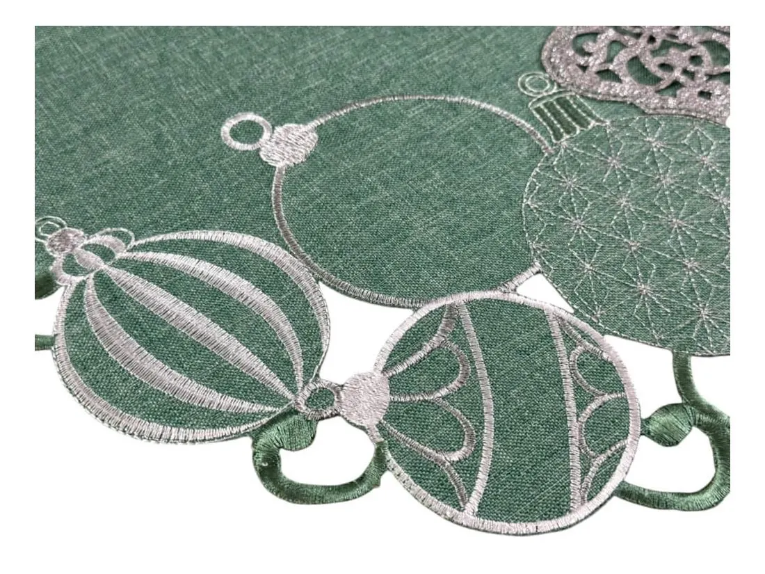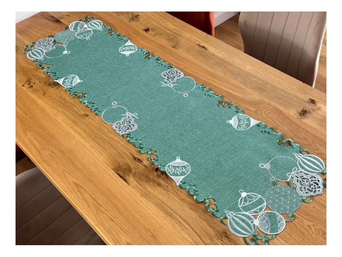 Delikatny haft srebrnych bombek, wzbogacony gdzieniegdzie o subtelną srebrną nitkę, nadaje bieżnikowi wyjątkowego blasku i subtelnej dekoracyjności. Ten bieżnik sprawdzi się doskonale, jeśli pragniesz szybko i efektownie wprowadzić świąteczny klimat do swojego domu — ozdobi stół, tworząc przytulną atmosferę i podkreślając magię świąt. Idealnie komponuje się z pozostałymi dekoracjami, tworząc harmonijną całość, która umili rodzinne chwile podczas świątecznych spotkań.