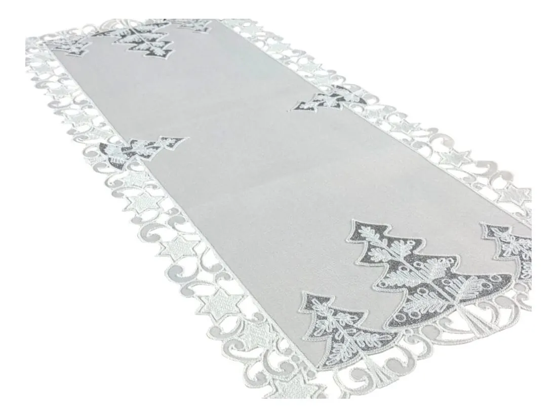 Bieżnik wyróżnia się subtelnym białym kolorem, symbolizującym świąteczną radość i ciepło rodzinnych chwil. Centralnym motywem dekoracyjnym są aplikacje w kształcie choinek, które pięknie połyskują srebrzystymi refleksami, przyciągając wzrok i dodając blasku każdemu wnętrzu. Dzięki srebrnym akcentom, bieżnik prezentuje się elegancko zarówno w świetle dziennym, jak i przy wieczornym oświetleniu, stając się idealnym tłem dla bożonarodzeniowej zastawy i świec.