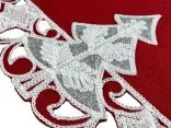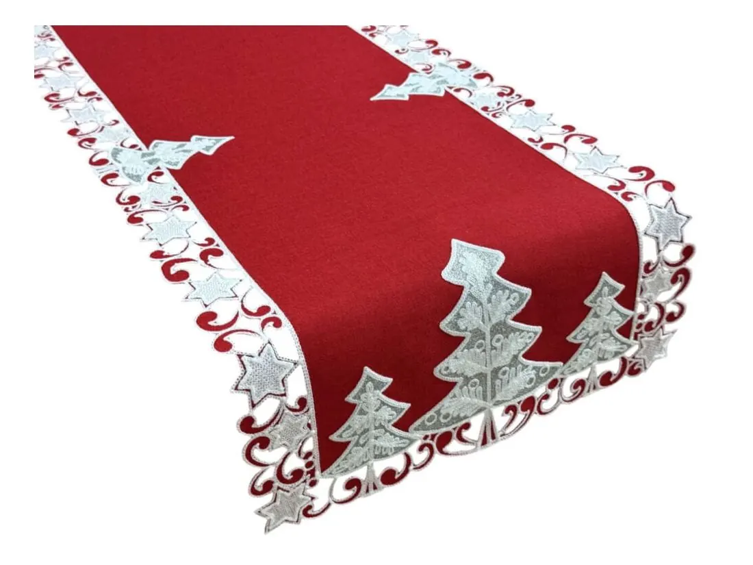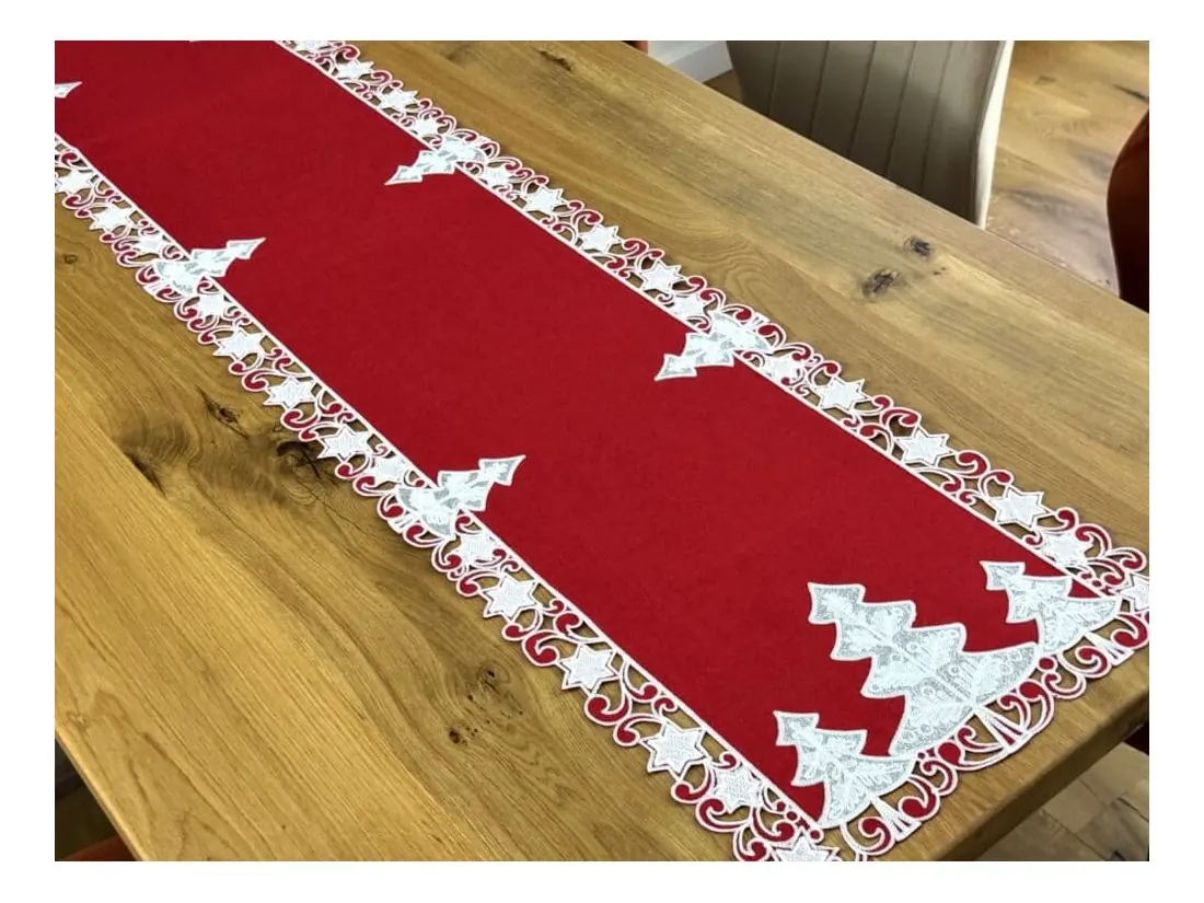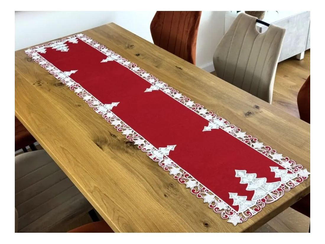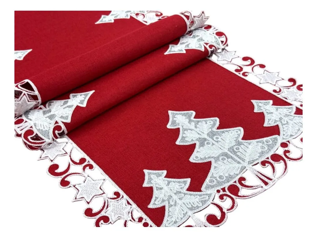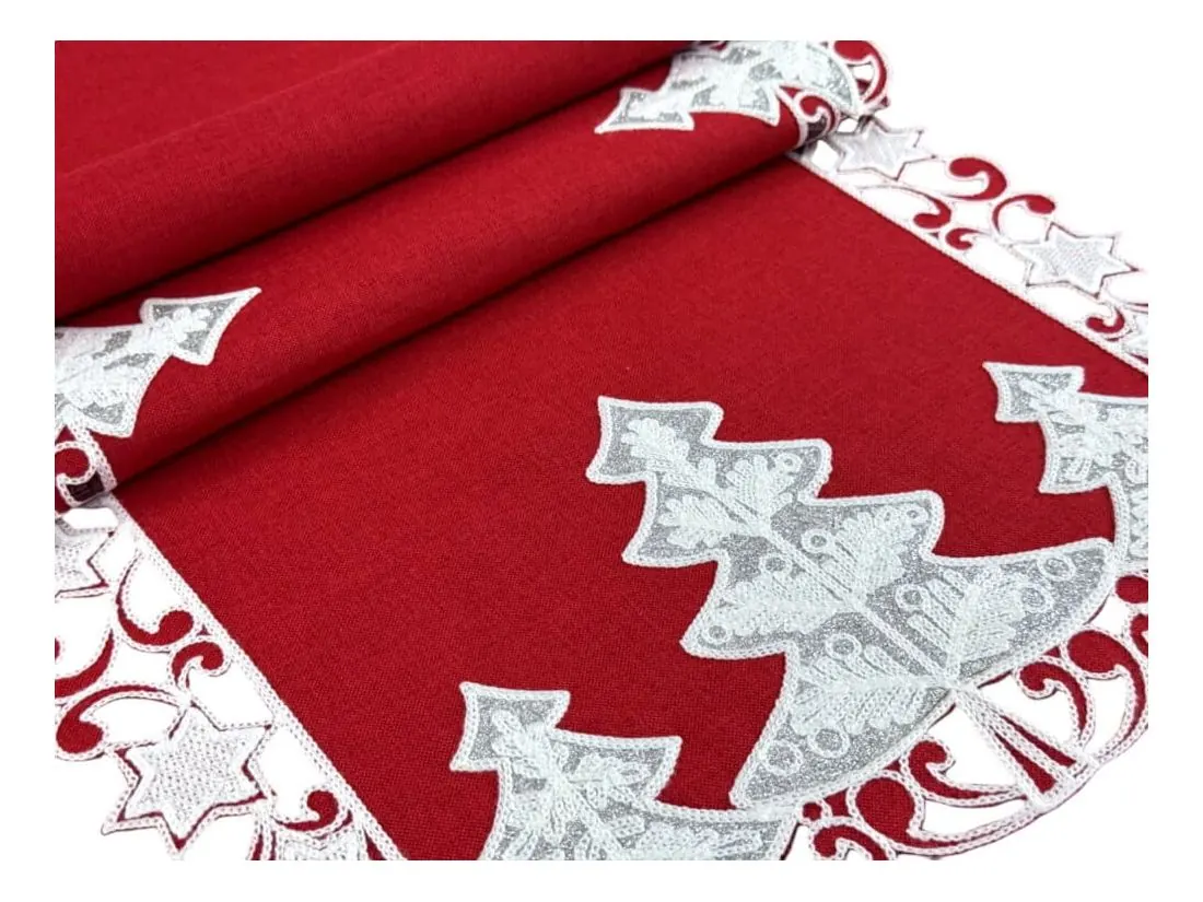 Bieżnik wyróżnia się głębokim, intensywnie czerwonym kolorem, symbolizującym świąteczną radość i ciepło rodzinnych chwil. Centralnym motywem dekoracyjnym są aplikacje w kształcie choinek, które pięknie połyskują srebrzystymi refleksami, przyciągając wzrok i dodając blasku każdemu wnętrzu. Dzięki srebrnym akcentom, bieżnik prezentuje się elegancko zarówno w świetle dziennym, jak i przy wieczornym oświetleniu, stając się idealnym tłem dla bożonarodzeniowej zastawy i świec.