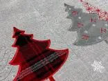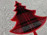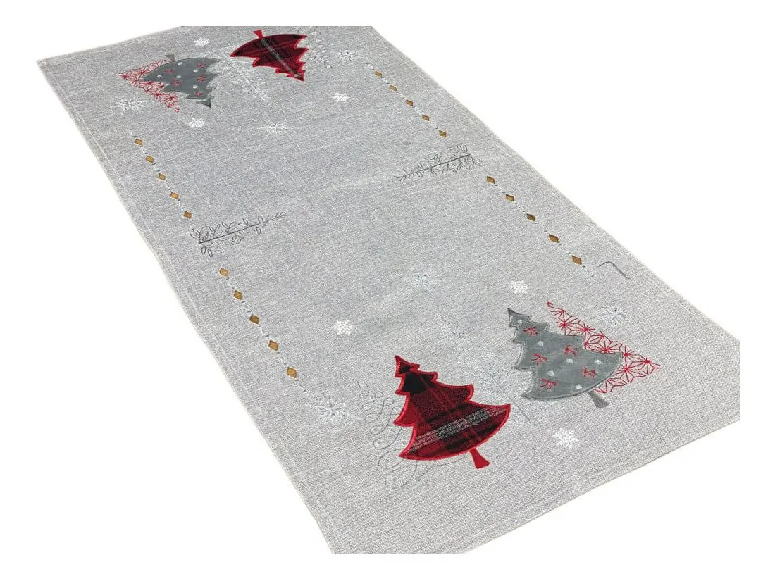 Bieżnik świąteczny w rozmiarze 40x85 cm w kolorze szarym z bogato zdobioną aplikacją czerwono srebrnych choinek, została wykonana na tkaninie lurex 100 % poliestrowej, charakteryzuje się nowoczesnym designem, świątecznym wzorem oraz modnym kolorem. Czerwona naszyta choinka jest z tkaniny w kratkę, srebrna choinka z miękkiego weluru. Dodatkową ozdobą nakładki są wycięcia wzdłuż bieżnika w formie łańcuszka. Dzięki zastosowanym srebrnym niciom w strukturze, tkanina lurex połyskuje.