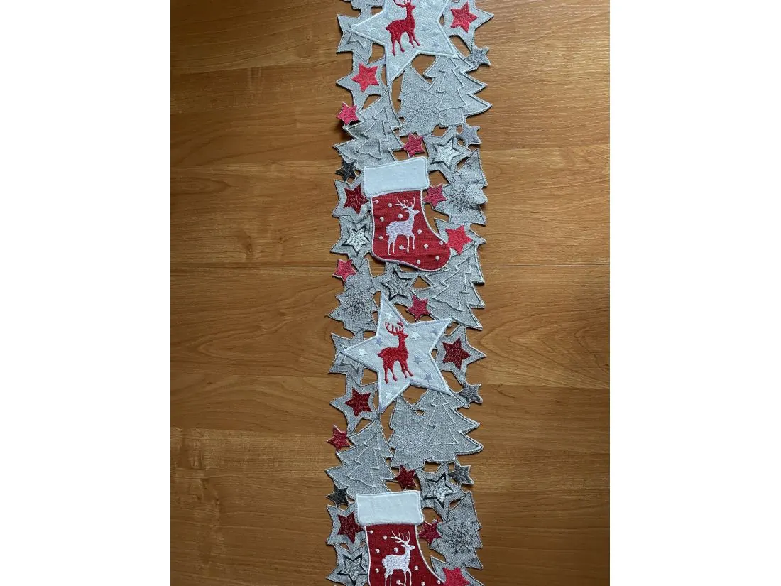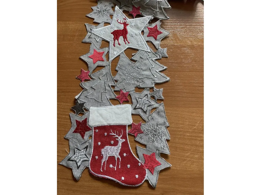 Nakładka świąteczna w rozmiarze 20x160 cm w kolorze szarym, z bogato zdobioną aplikacja świąteczną choinki, renifera, gwiazdek została wykonana na tkaninie 100 % poliestrowej, charakteryzuje się nowoczesnym designem, świątecznym wzorem oraz modnym kolorem.
