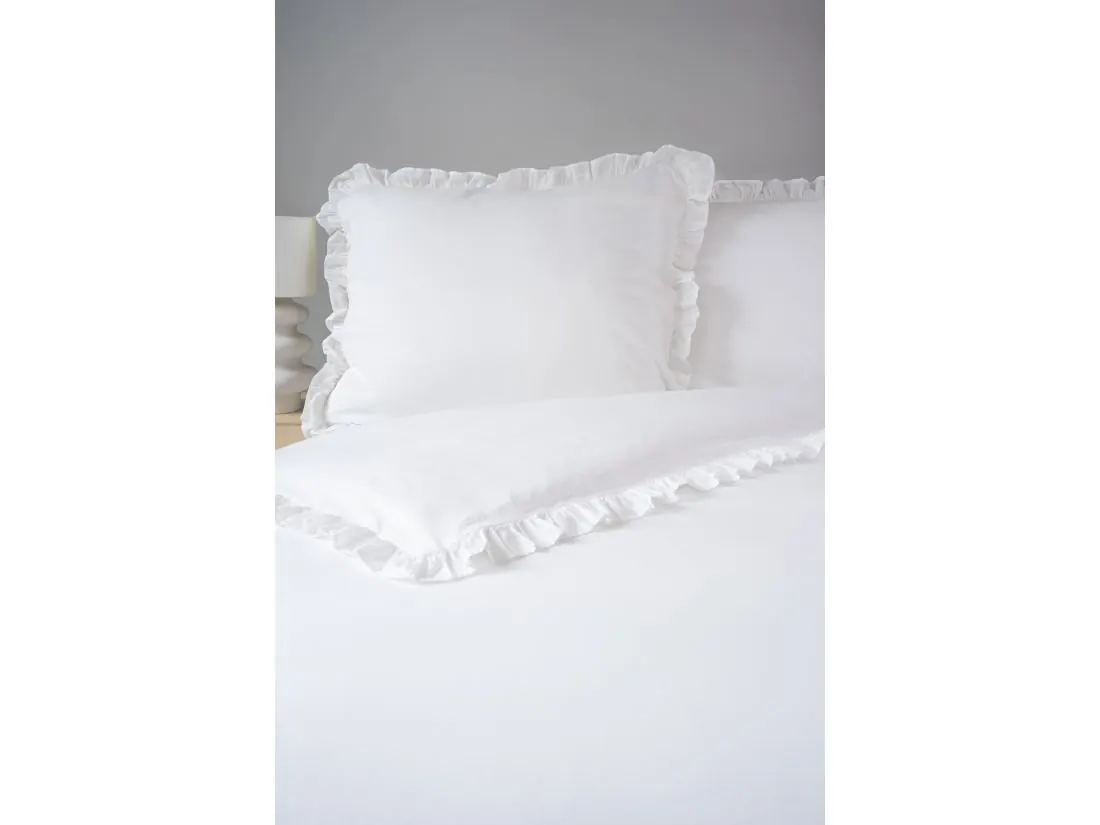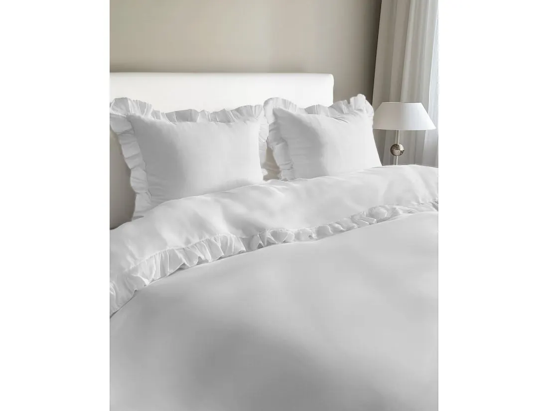 Wzór jest gładki, bez dodatkowych nadruków czy grafik. Rolę dekoracyjną pełnią jedynie falbanki, które dodają pościeli elegancji, romantyzmu i ponadczasowego uroku.