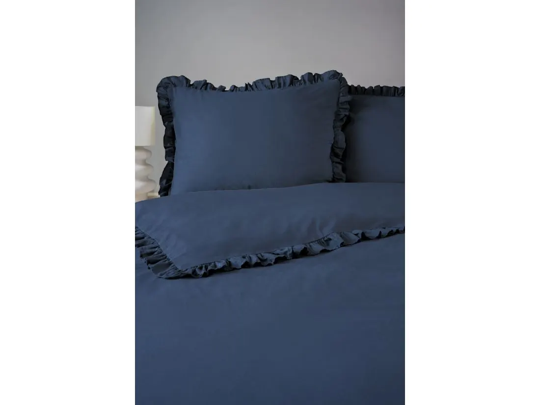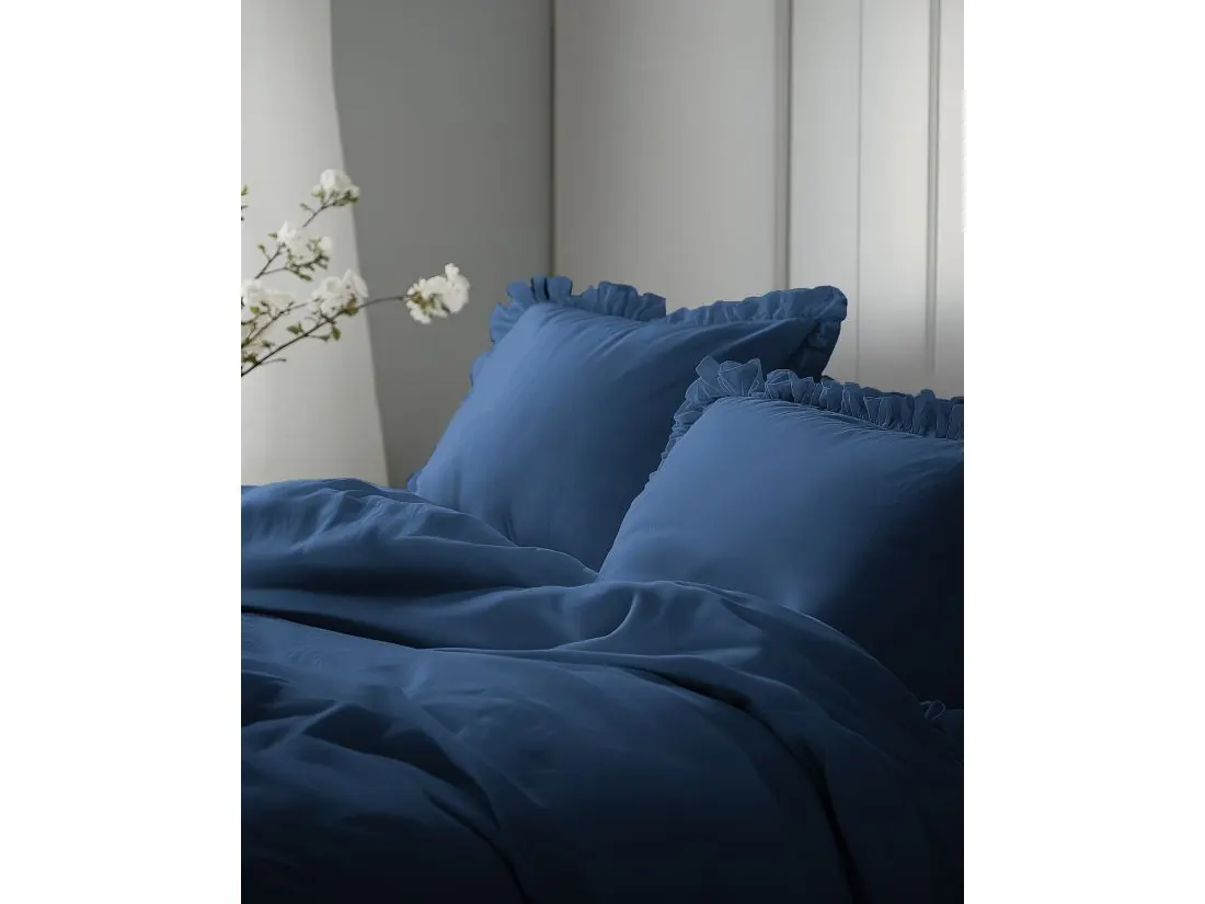 Pościel utrzymana jest w głębokim, denimowym odcieniu niebieskiego, który łączy nowoczesność z ponadczasową elegancją. Kolor jest intensywny, wyrazisty, a jednocześnie harmonijny — wnosi do wnętrza spokój i przyjemną atmosferę sprzyjającą odprężeniu.
