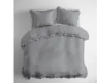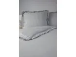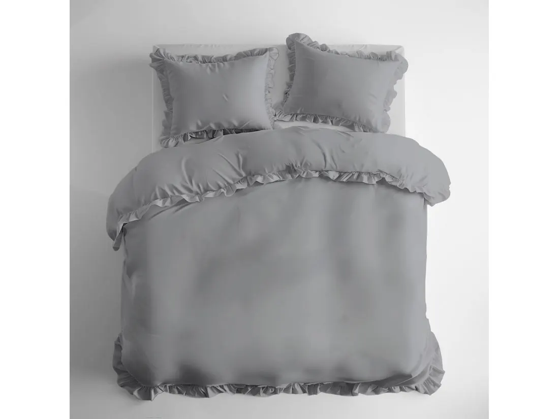 Pościel utrzymana jest w jasnoszarym, neutralnym odcieniu – eleganckim i ponadczasowym. Wzór jest gładki, bez nadruków, a dekoracyjne falbanki na brzegach poszwy i poduszek dodają całości subtelnej elegancji, lekkości i dekoracyjnego charakteru.