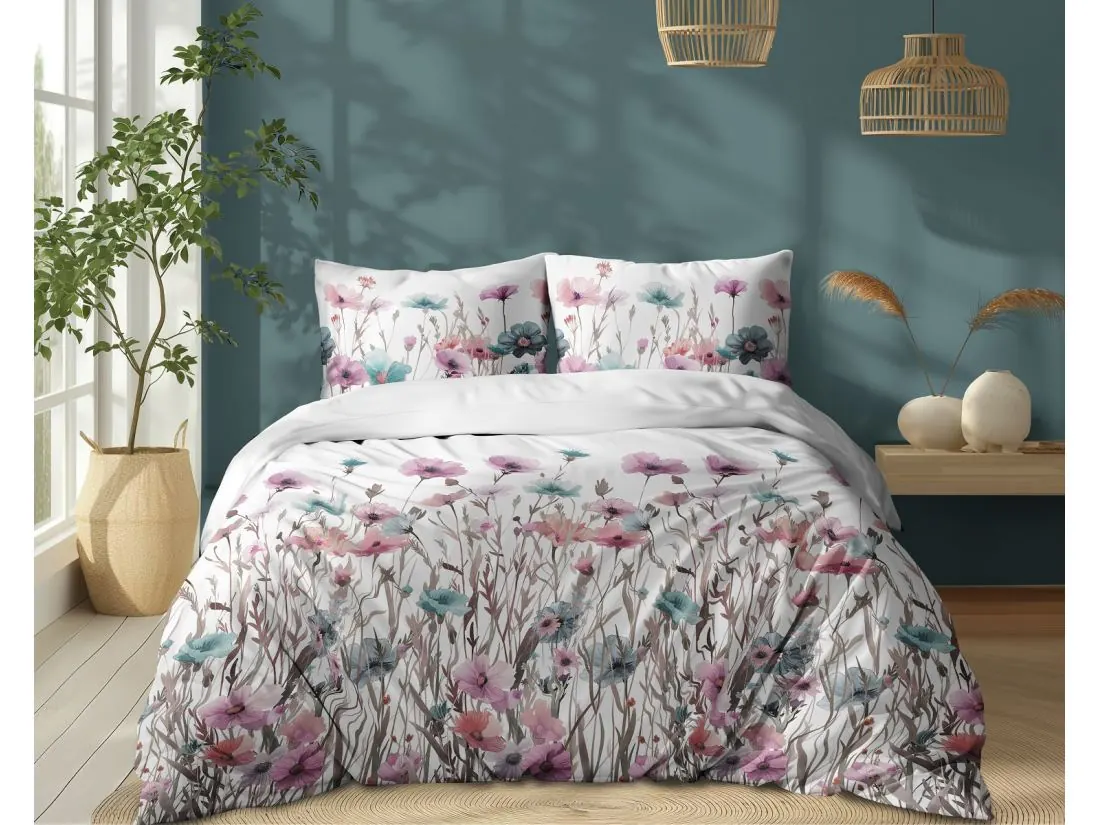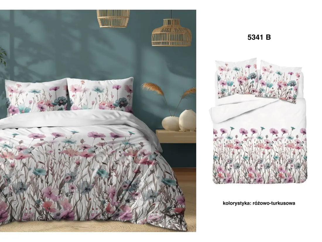 Pościel z bawełny 220x200 +2/70x80 turkusowe, różowe maki wz. 5341 b
