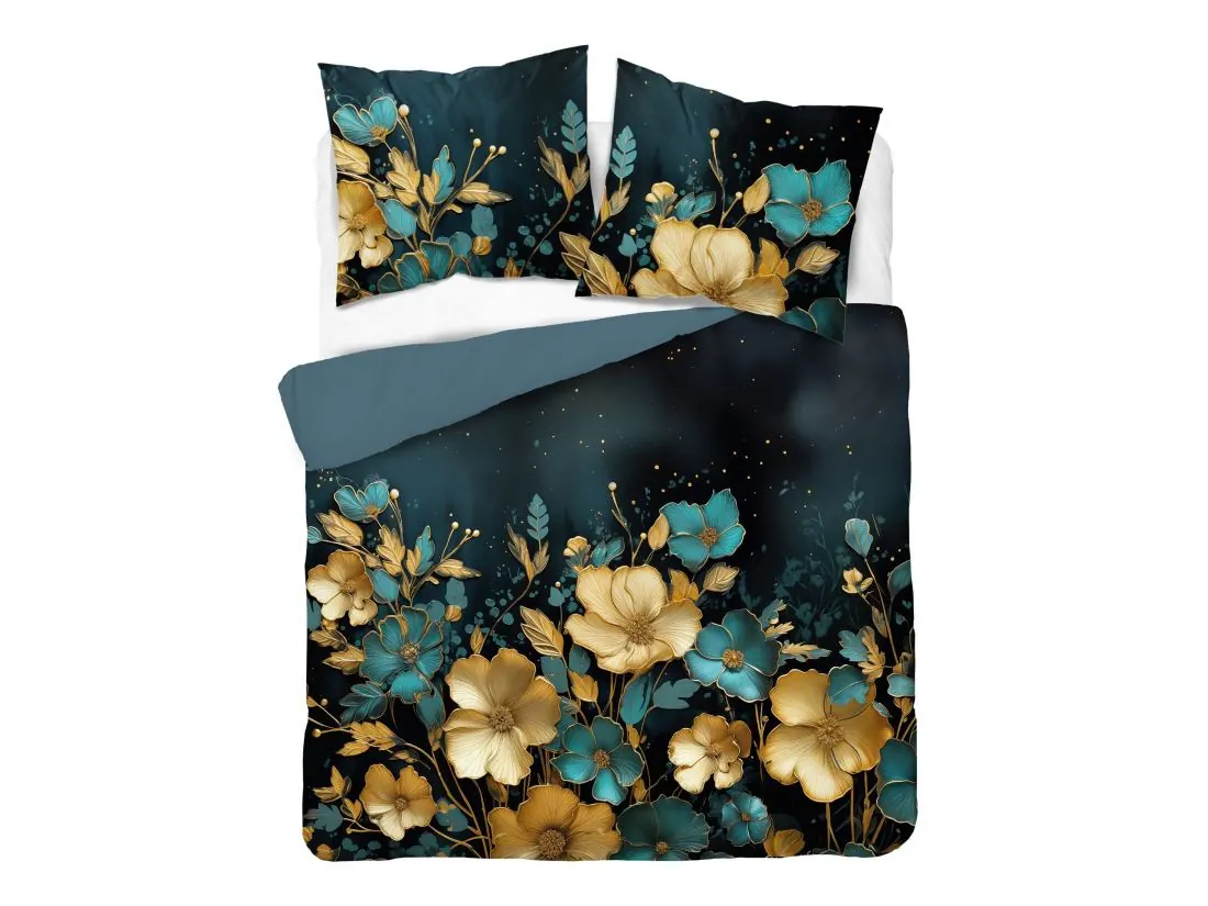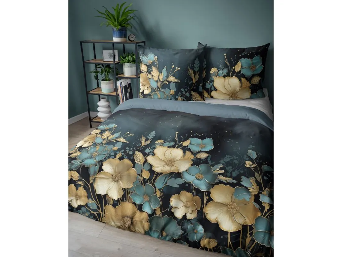 Pościel z bawełny 220x200 +2/70x80 złoty, turkusowy zawilec holland collection holenderska 3D