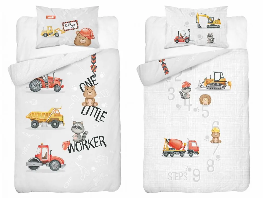 Dwustronny wzór "Pracujące Zwierzątka" przedstawia wesołe zwierzątka zajęte pracą w otoczeniu maszyn budowlanych, takich jak koparki i spychacz, na jasnoszarym tle. Kolorowy i przyjazny motyw zachwyci każdego malucha, rozweselając pokój i wprowadzając radosną atmosferę.