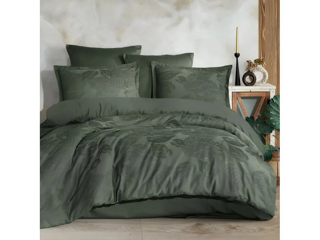 Unikalny proces barwienia przędzy przed tkaniem zapewnia trwałość kolorów oraz niezmienną miękkość i gładkość przez długie lata. Motyw liści w kolorze ciemnozielonym dodaje pościeli wyrafinowanej elegancji, doskonale komponując się z luksusową aranżacją każdej sypialni.