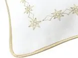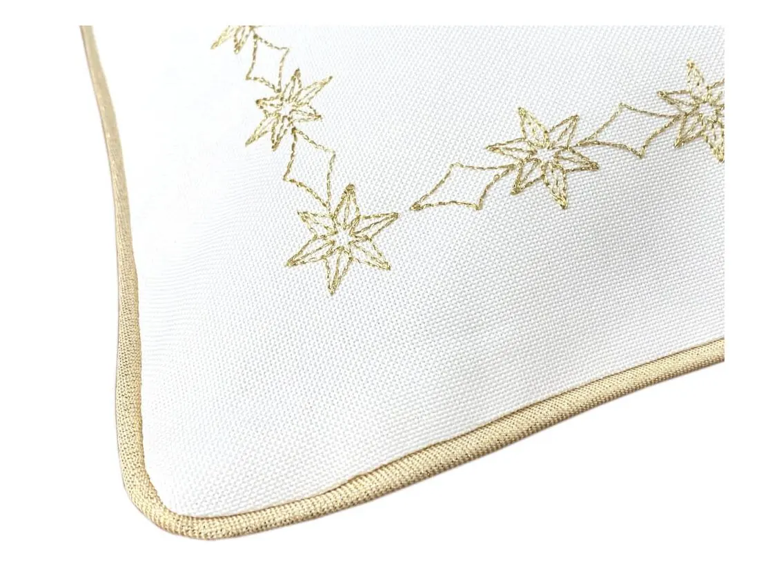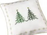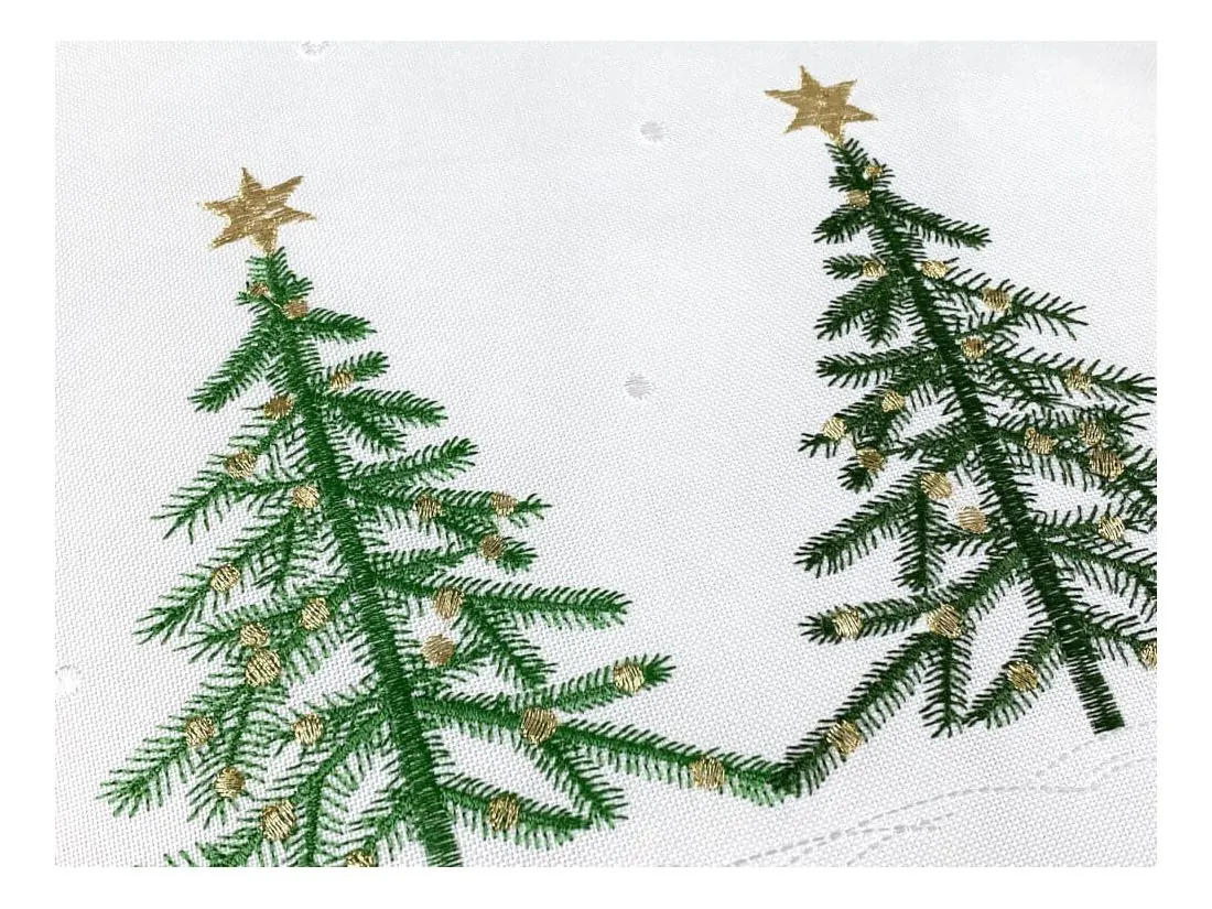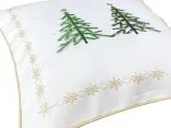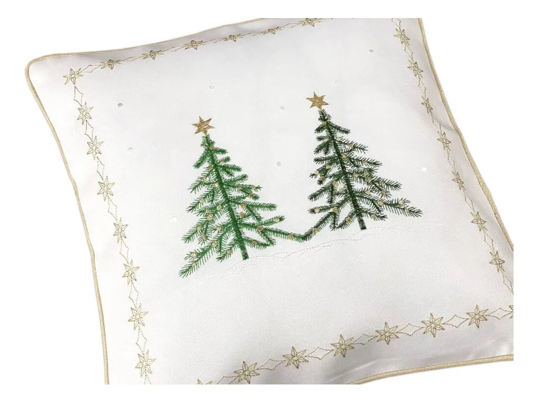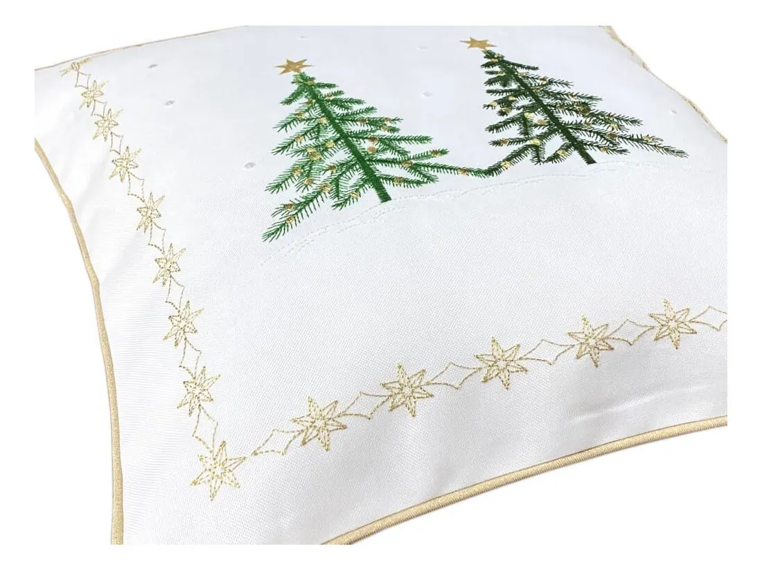 Dekoracyjna poszewka w rozmiarze 40x40 cm w kolorze białym została wykonana na tkaninie 100 % poliester, charakteryzuje się świątecznym wzorem oraz modnym kolorem z precyzyjnie naszytymi zielonymi choinkami w otoczeniu magicznych złotych gwiazdek, która magicznie podkreśli klimat Świąt Bożego Narodzenia. Brzegi poszewki otacza złota lamówka.