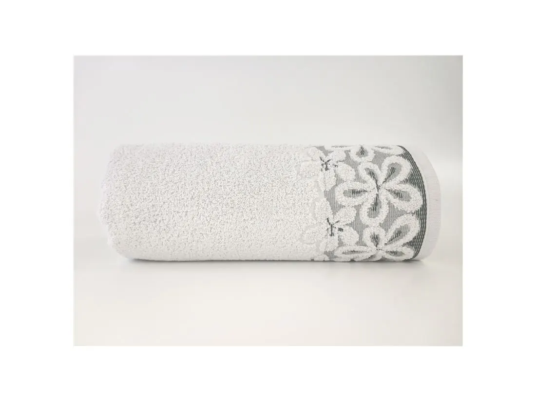 Ręcznik Bella w rozmiarze 30 x 50 cm w kolorze gołębim - jasny popiel, firmy Greno, to delikatny ręcznik z botique collection. Gruby, mięsisty jednobarwny ręcznik z delikatną alpikacją kwiatową wykonany z wysokogatunkowej bawełny.
