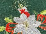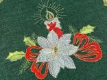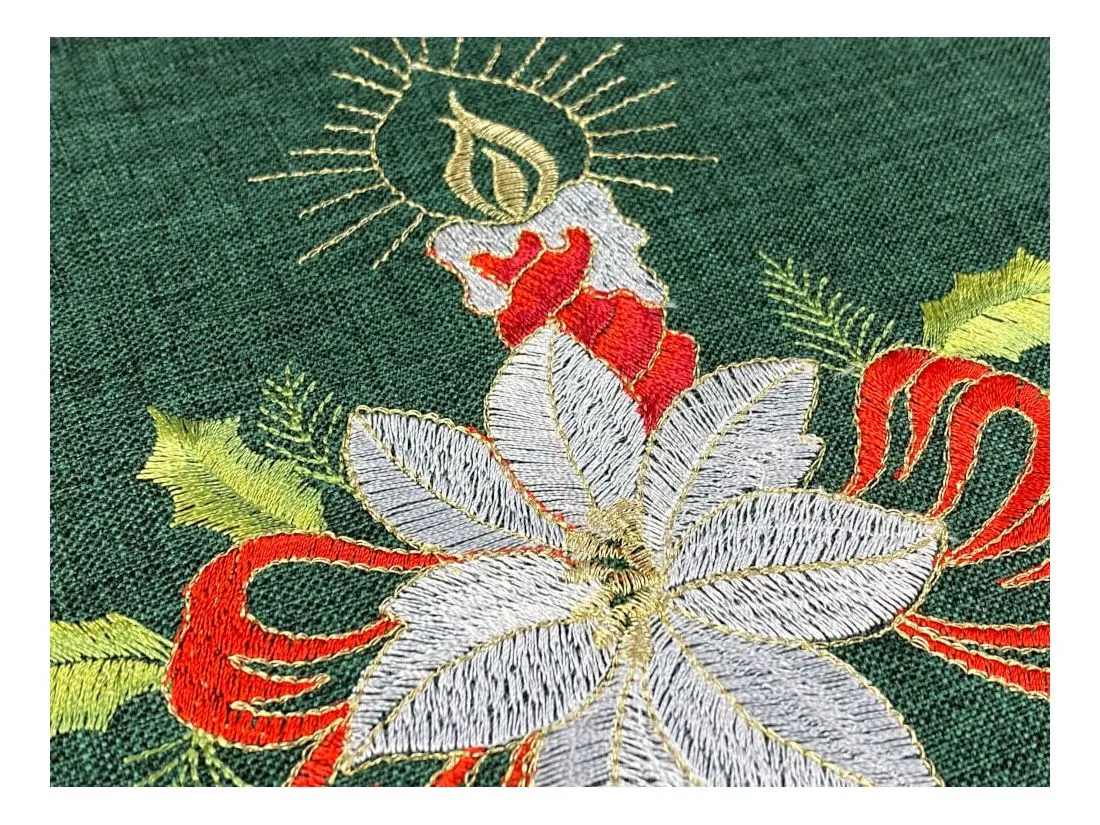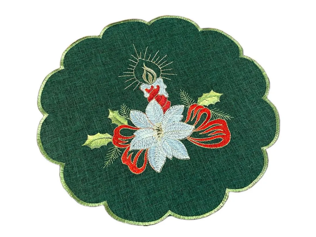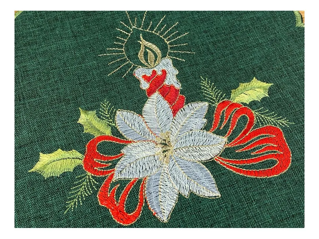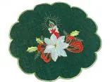 Serwetka świąteczna o średnicy 30 cm w kolorze ciemno zielonym z bogato zdobioną aplikacja świątecznego stroika została wykonana z tkaniny 100 % poliestrowej, charakteryzuje się nowoczesnym designem, świątecznym wzorem oraz modnym kolorem. Aplikacja haftu gwiazdy betlejemskiej oraz klimatycznej świecy na serwetce świątecznej jest w kolorze biało czerwonym przeplataną złotą nitką.