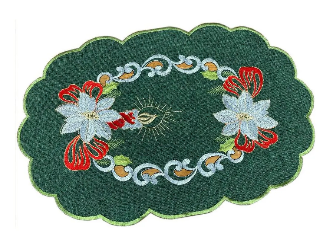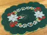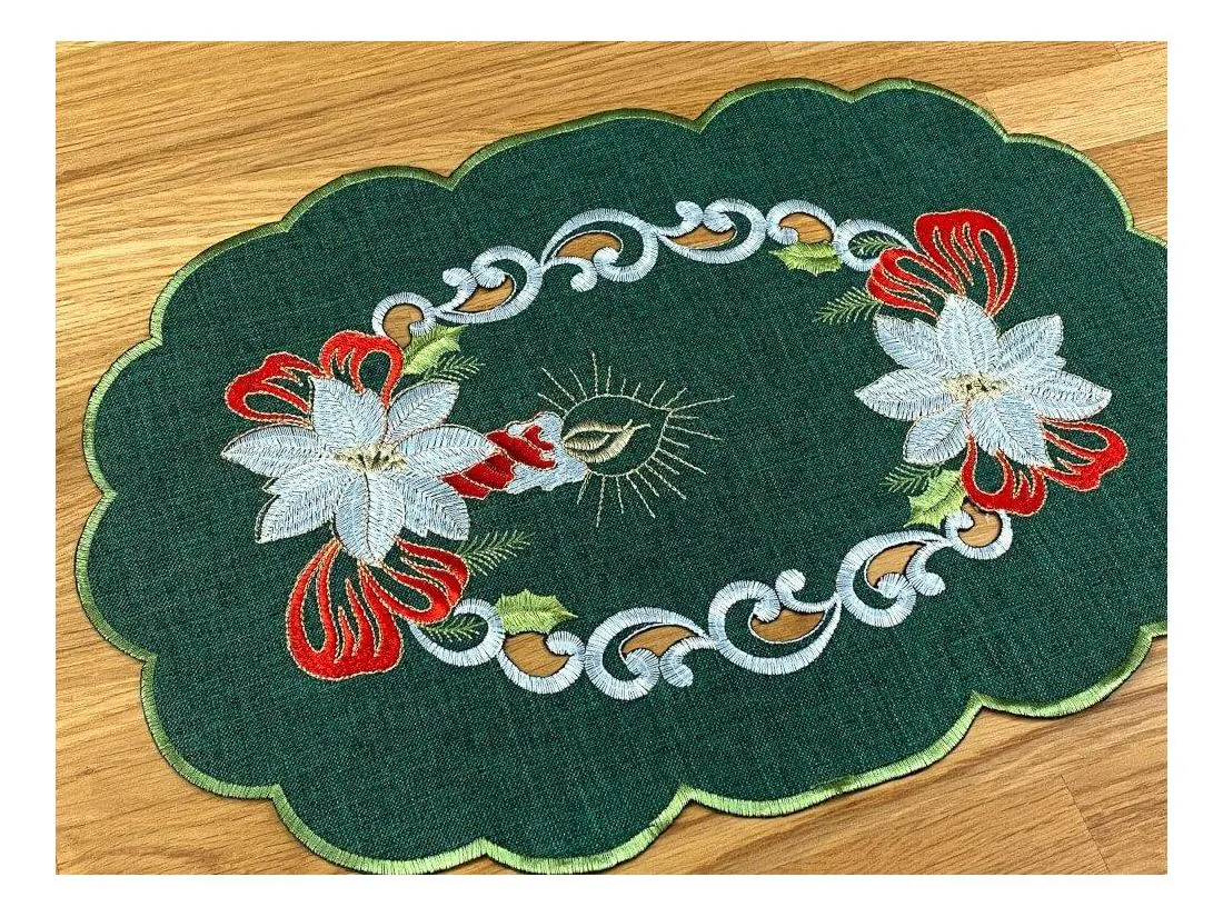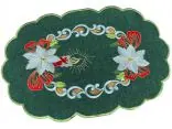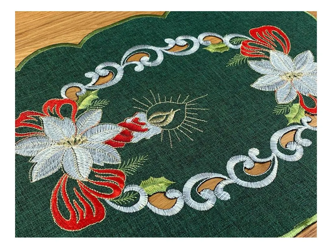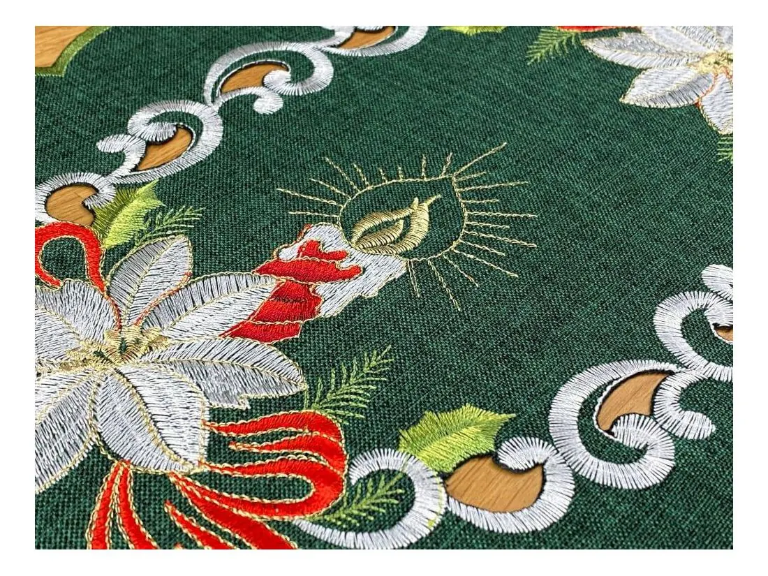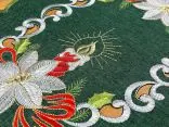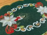 Bieżnik świąteczny w rozmiarze 30x45 cm w kolorze ciemno zielonym z bogato zdobioną aplikacja świątecznego stroika została wykonana z tkaniny 100 % poliestrowej, charakteryzuje się nowoczesnym designem, świątecznym wzorem oraz modnym kolorem. Aplikacja haftu gwiazdy betlejemskiej oraz klimatycznej świecy na serwetce świątecznej jest w kolorze biało czerwonym przeplataną złotą nitką.