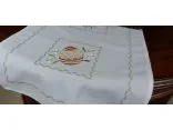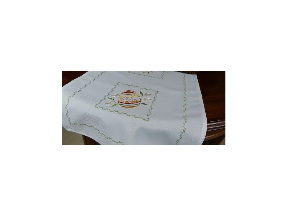 Kolorystyka nakładki jest w kolorze białym z wyhaftowanym motywem jajek wielkanocnych wspaniale udekoruje każdy stół, ławę podkreślając klimat świąteczny.