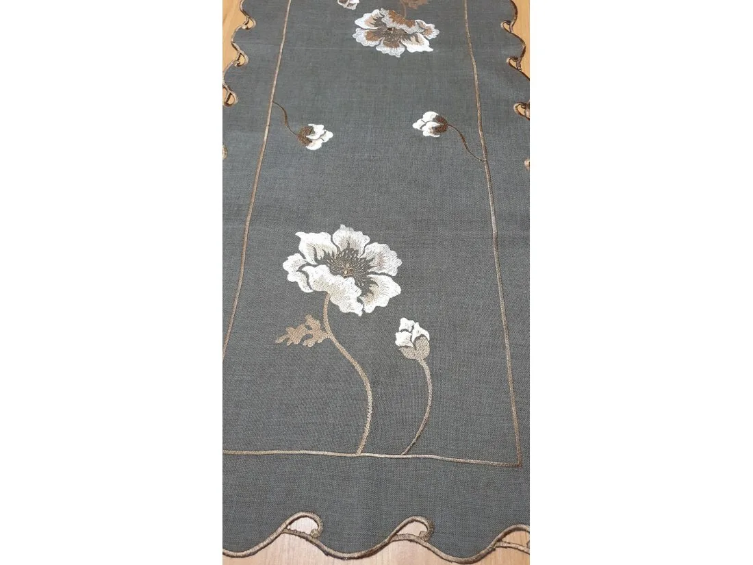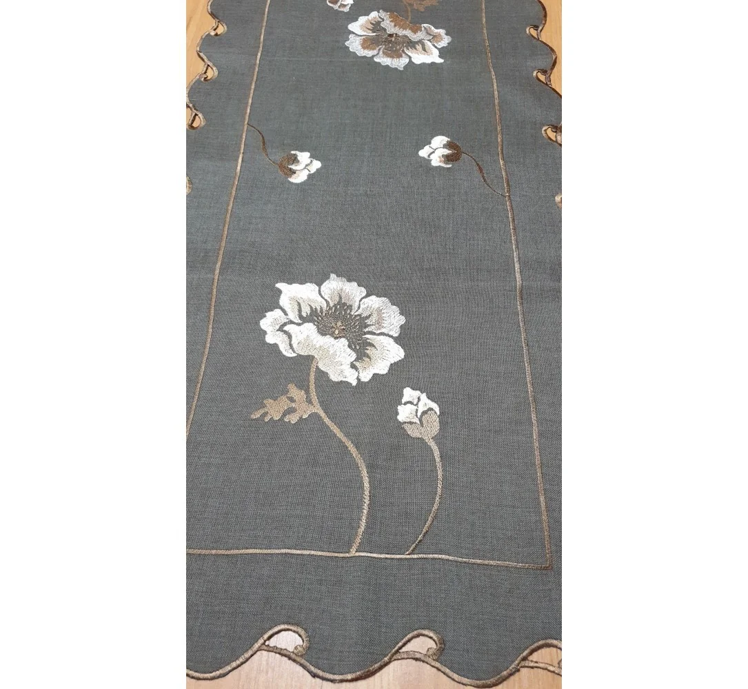 Dekoracyjny haftowany bieżnik w rozmiarze 40 x 90 cm w kształcie prostokątnym został wykonany z tkaniny 100 % poliestrowej w kolorze brązowo beżowym.