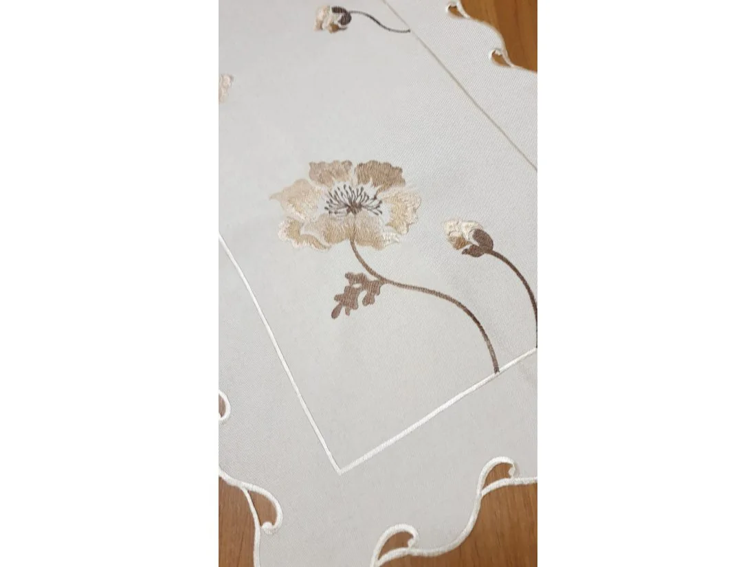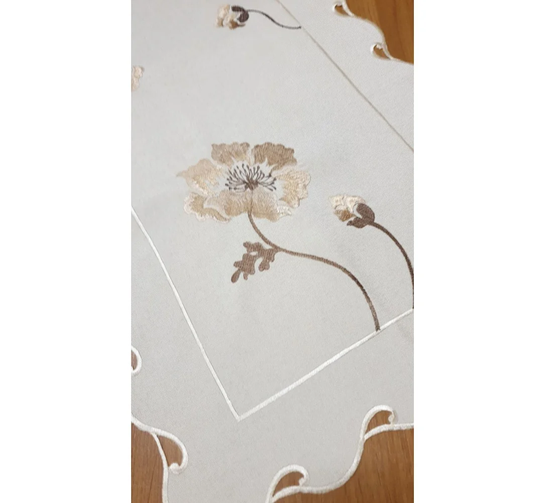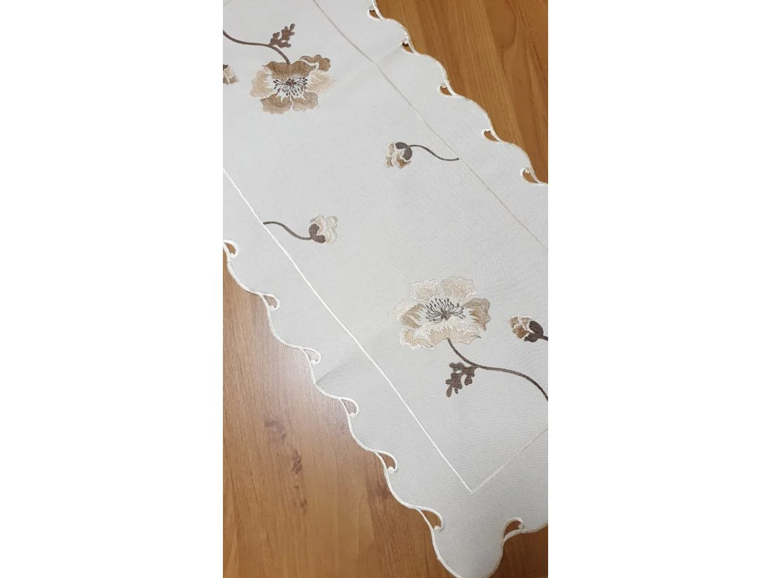 Haftowana nakładka charakteryzuje się nowoczesnym desingiem, prostym delikatnym wzorem beżowo brązowej róży oraz modnym kremowym kolorem. Precyzyjne dekoracyjne wykończenie bieżnika dodatkowo udekoruje stół, ławę.