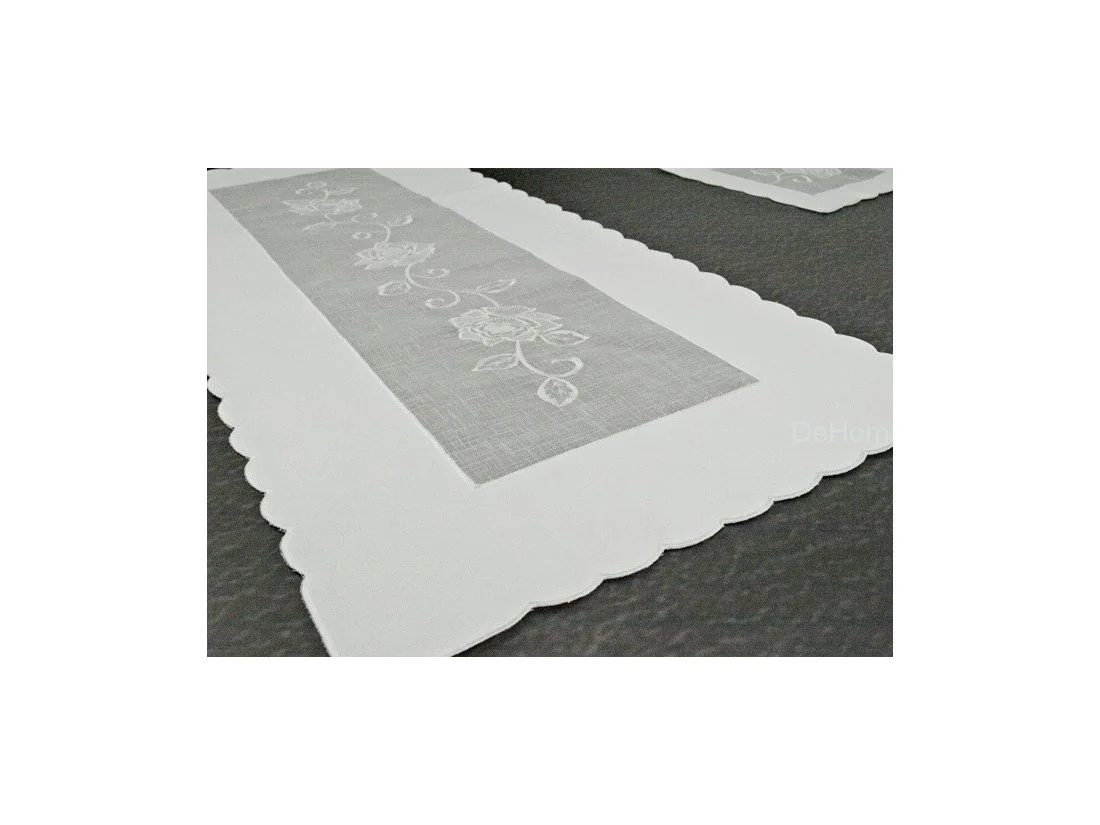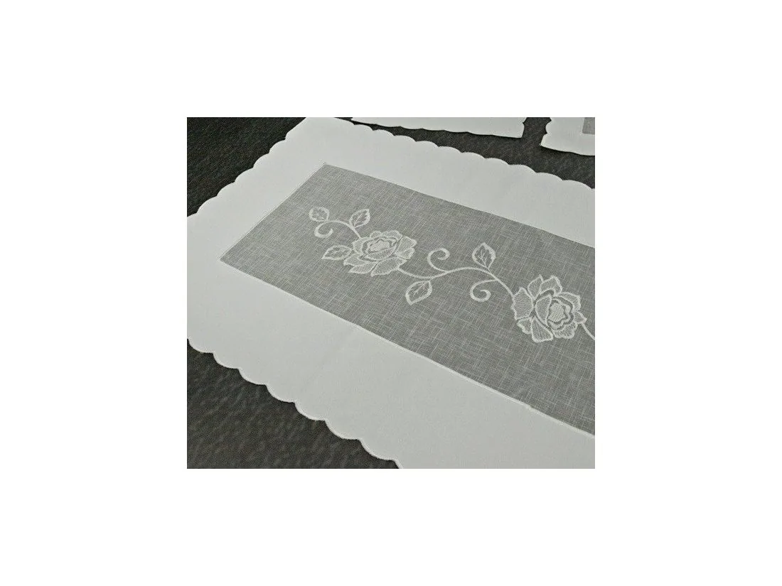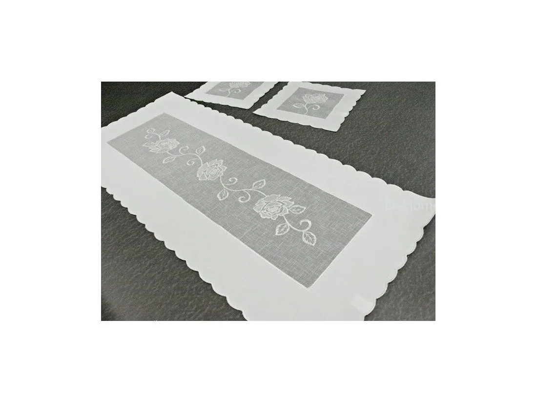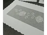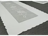 Elegancki haftowany bieżnik nakładka w rozmiarze 60x120 cm z różą w kolorze białym w kształcie prostokątnym.