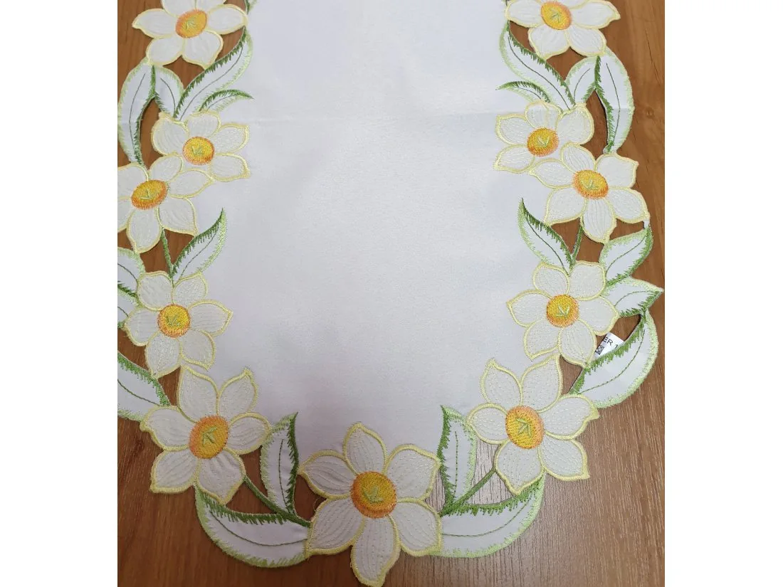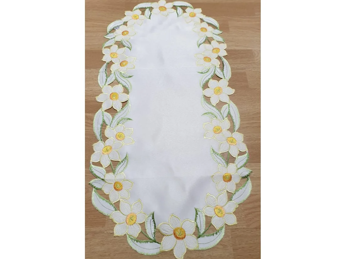 Dekoracyjny bieżnik haftowany Żonkil w rozmiarze 35 x 70 cm został wykonany z tkaniny 100 % poliestrowej w kolorze jasno kremowym z delikatna aplikacją haftu wiosennych kwiatów.