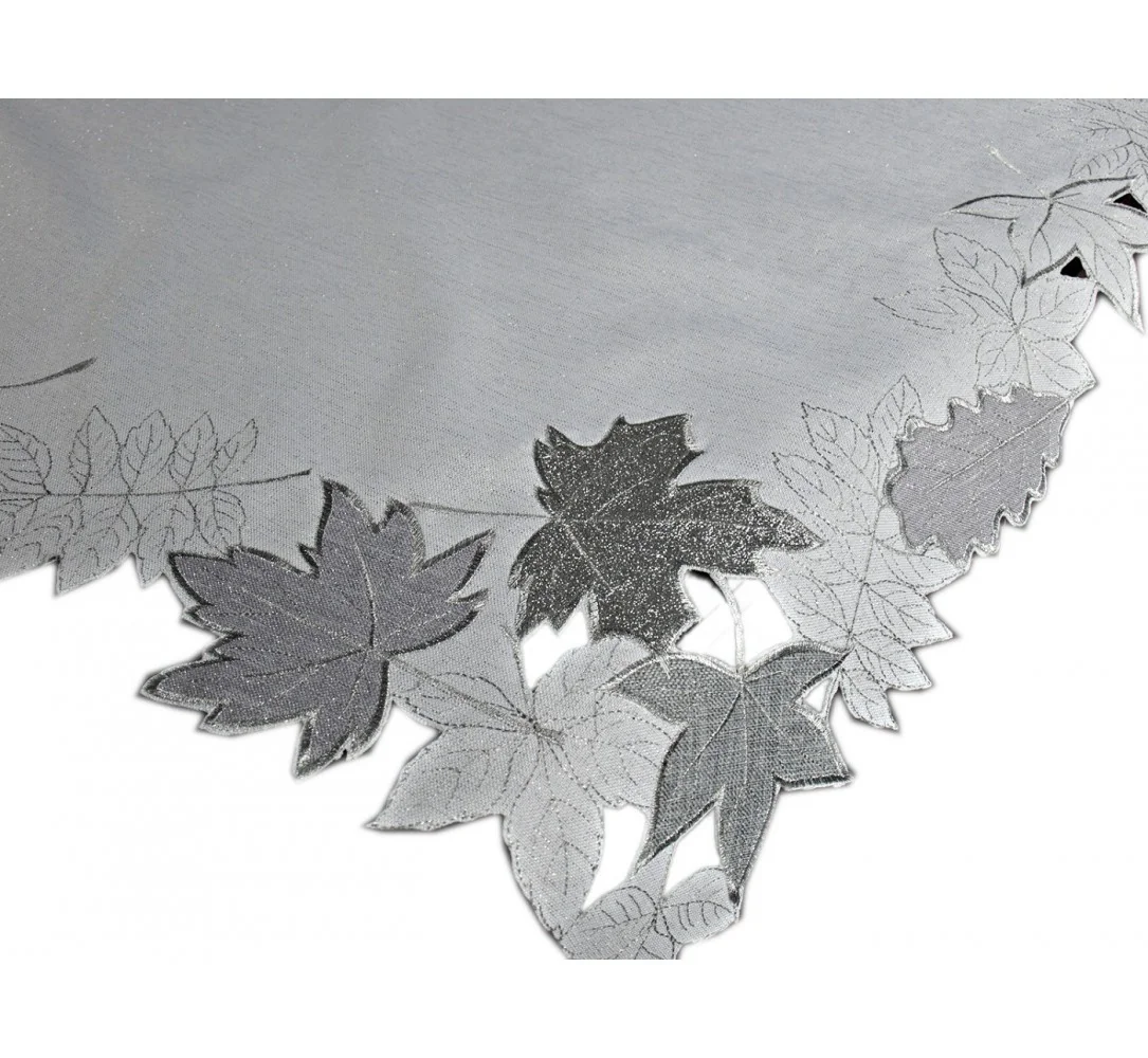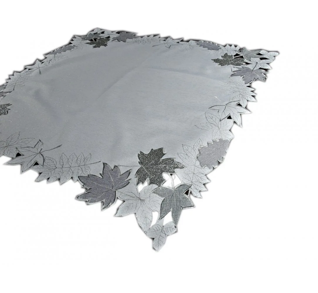 Dekoracyjny haftowany bieżnik w rozmiarze 85 x 85 cm w kolorze białym z aplikacja liści została wykonana na tkaninie lurex* - 100 % poliestrowej, charakteryzuje się nowoczesnym desingiem, prostym wzorem oraz modnym kolorem. Liście na nakładce ozdobione są srebrną nitką, niektóre w całości pokryte tkaniną przypominająca brokat.