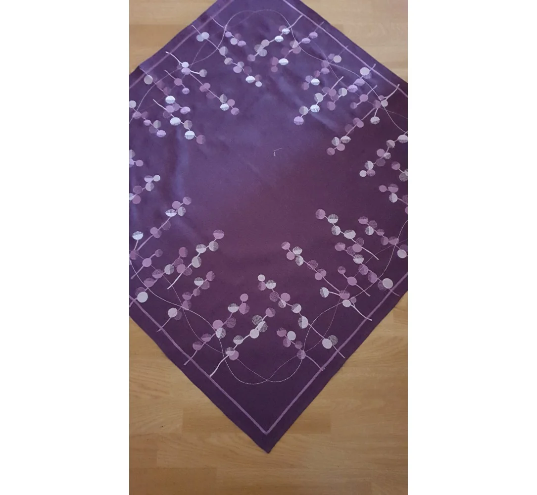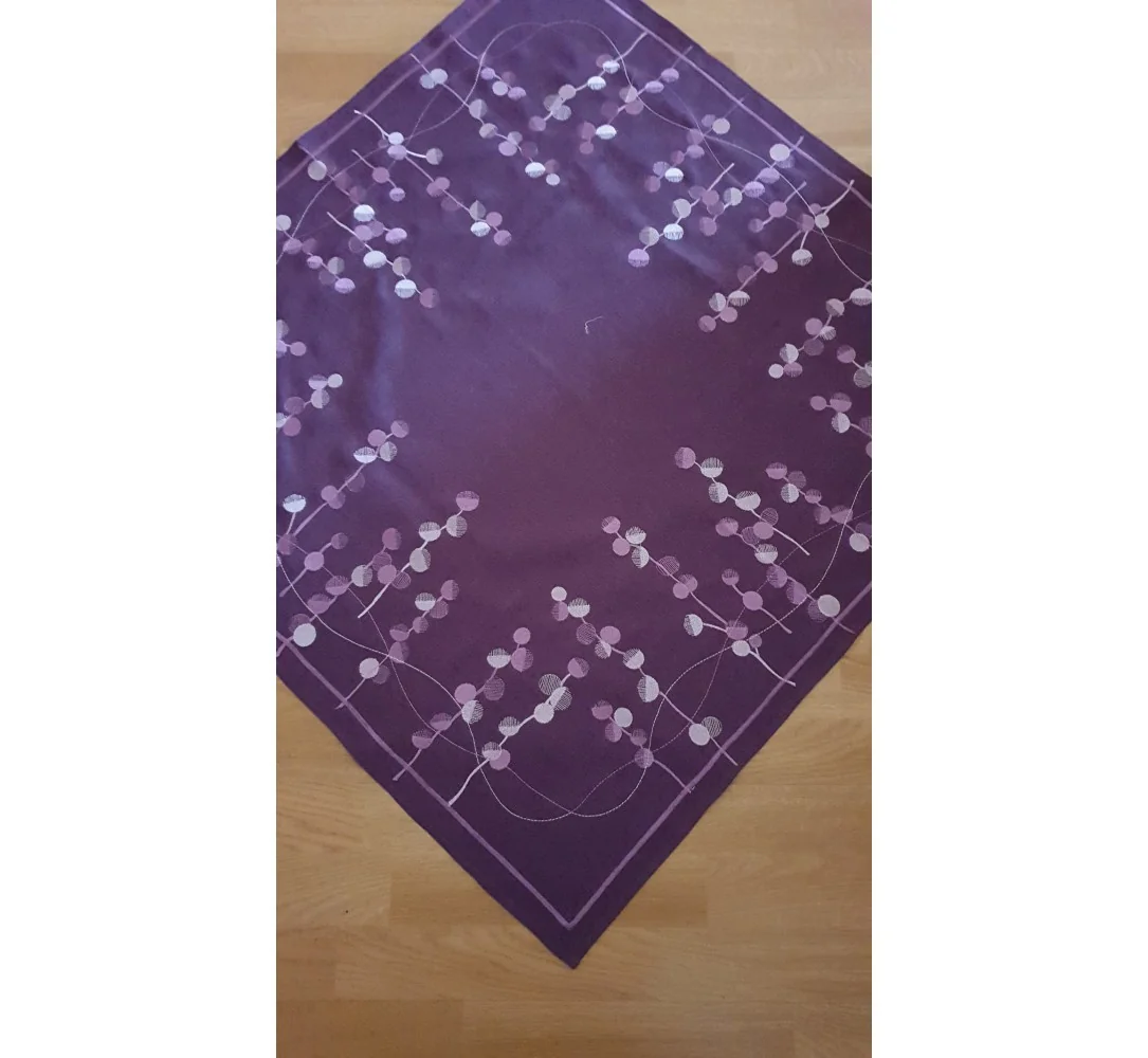 Bieżnik haftowany w rozmiarze 85x85 cm w kształcie kwadratowym został wykonany z tkaniny 100 % poliestrowej w kolorze fioletowym z aplikacja geometrycznego haftu.