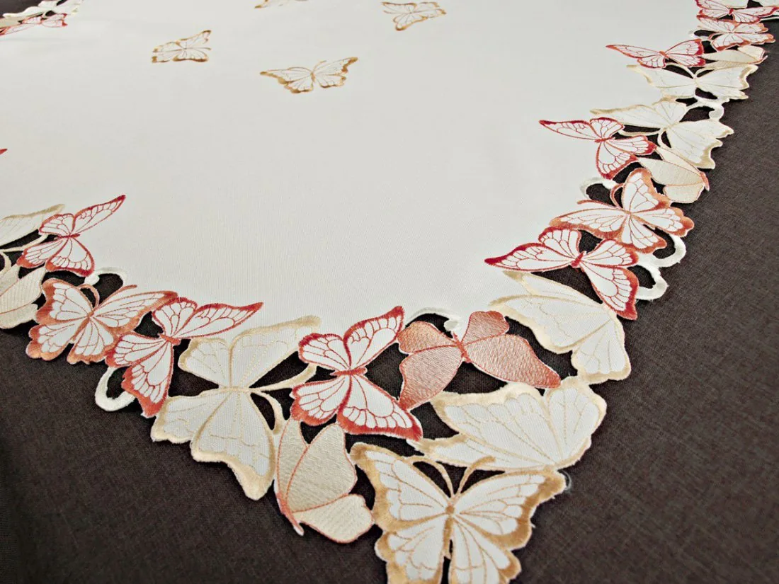 Haftowany bieżnik w rozmiarze 85 x 85 cm w kolorze pomarańczowo żółtym z haftem w motylki.