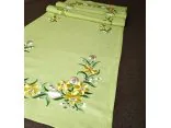 Bieżnik wyróżnia się kunsztownym haftem maszynowym o wyjątkowej dbałości o detale. Kwiaty żonkili wraz z pąkami i liśćmi zostały rozmieszczone symetrycznie w rogach tkaniny, co nadaje całości elegancki i uporządkowany charakter. Zielona tkanina o strukturze imitującej len stanowi doskonałe tło dla słonecznych barw haftu, tworząc kompozycję idealną na wielkanocny stół oraz cały sezon wiosenny.