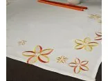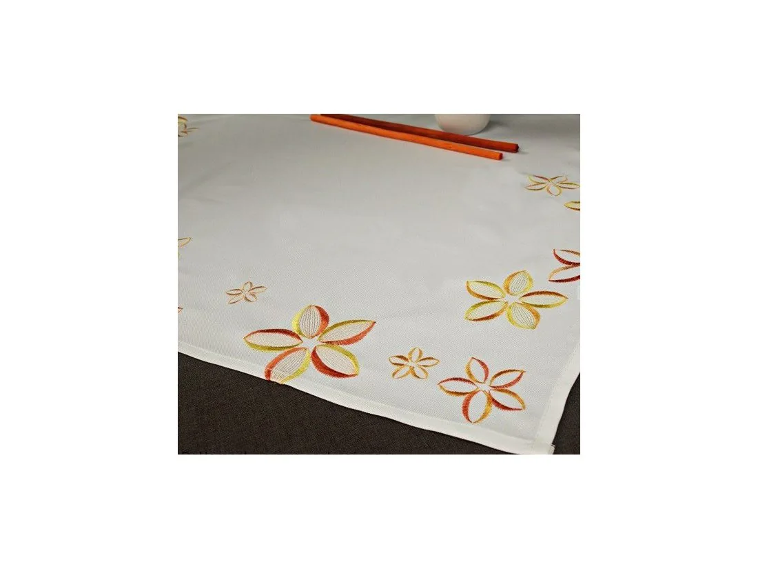 Klasyczna serweta/ bieżnik 85x85 cm w kształcie kwadrata wykonana z tkaniny 100 % poliestrowej w kolorze złamanej bieli z aplikacja haftu delikatnych kwiatuszków.