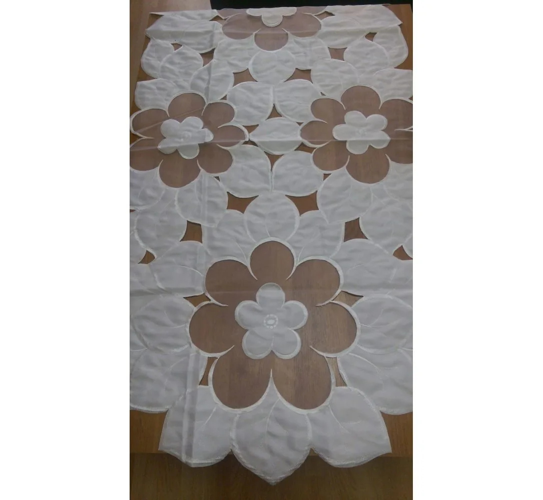 Bieżnik z haftem 60x120 cm został wykonany z wysokiej jakości tkaniny poliestrowej, dzięki starannemu połączeniu tkaniny z woalem oraz delikatnym haftem motywu kwiatowego w kolorze białym nakładka będzie ozdobą każdego wnętrza.