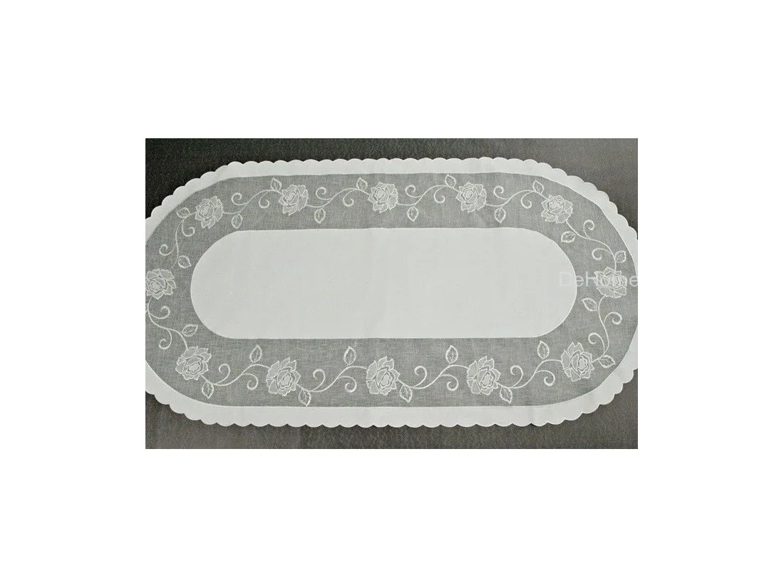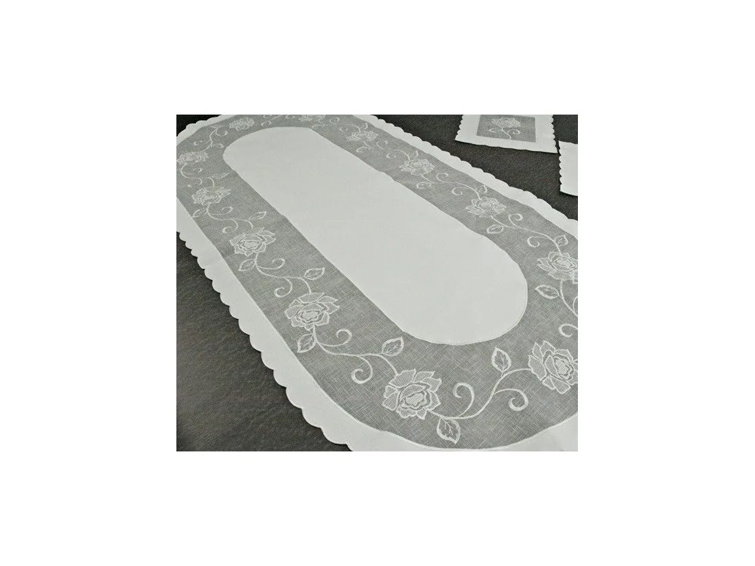 Elegancki haftowany bieżnik nakładka w rozmiarze 60x120 cm z różą w kolorze białym w kształcie owalnym.