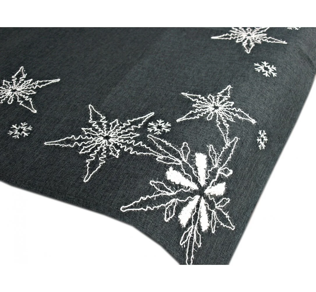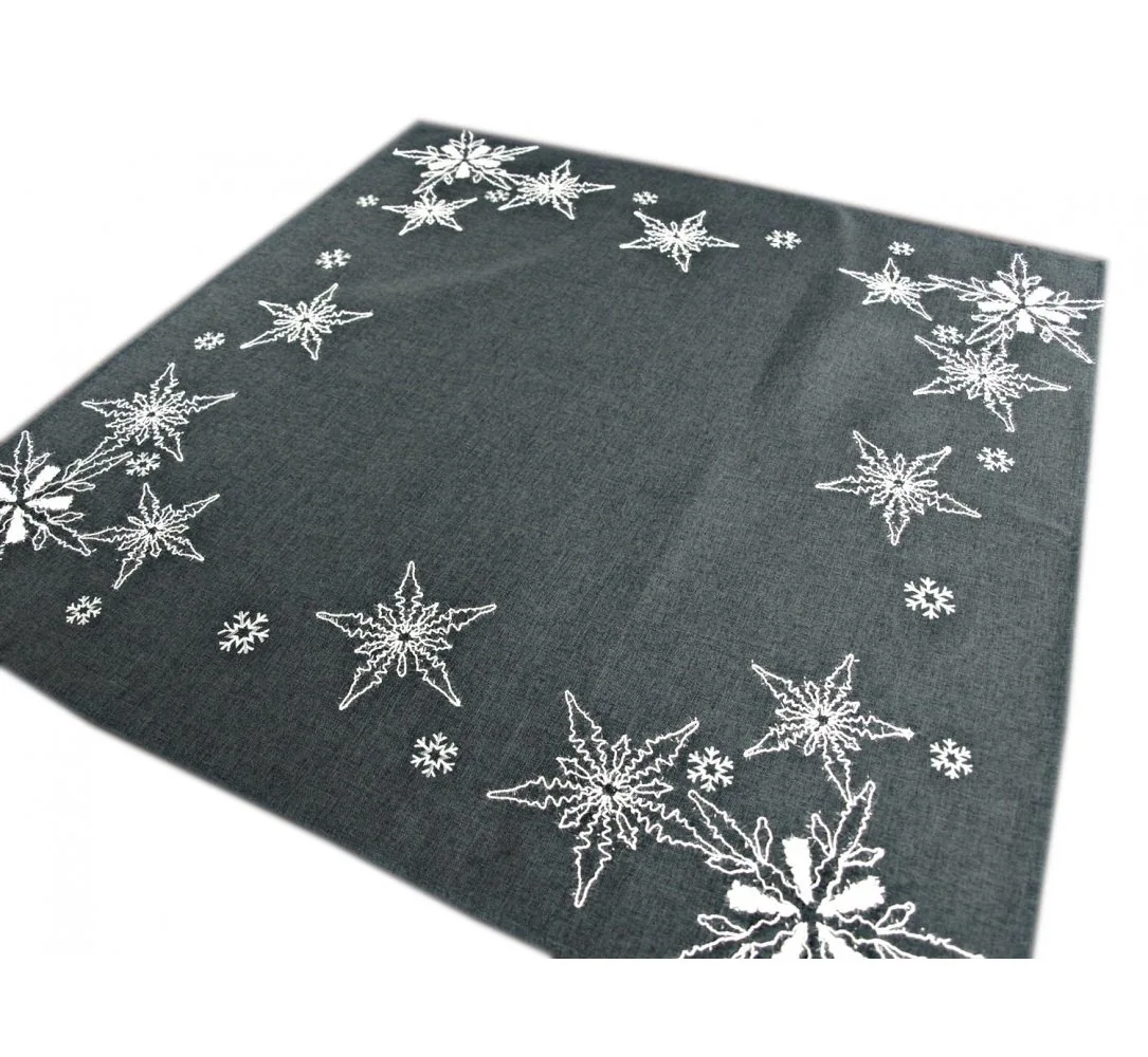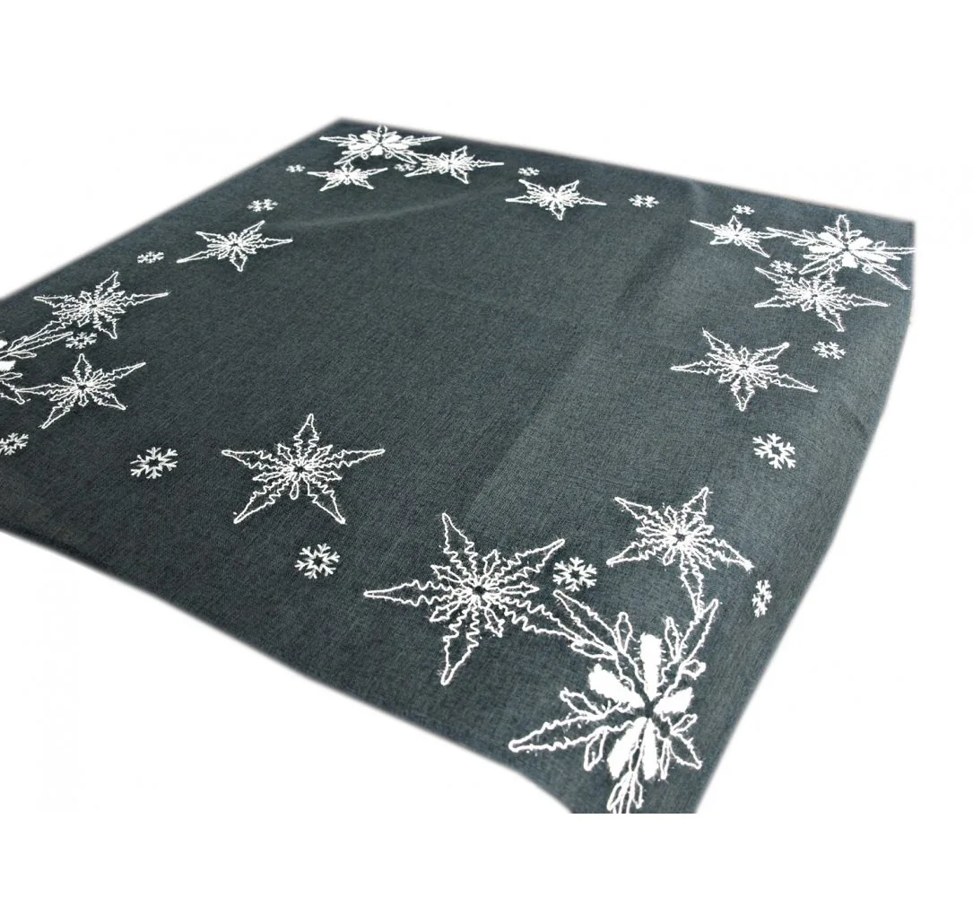 Nakładka świąteczna w rozmiarze 85x85 cm w kolorze grafitowym z aplikacja haftowanej białej gwiazdy, została wykonana z tkaniny 100 % poliestrowej. Charakteryzuje się nowoczesnym desingiem, świątecznym nastrojowym wzorem oraz modnym świątecznym kolorem.