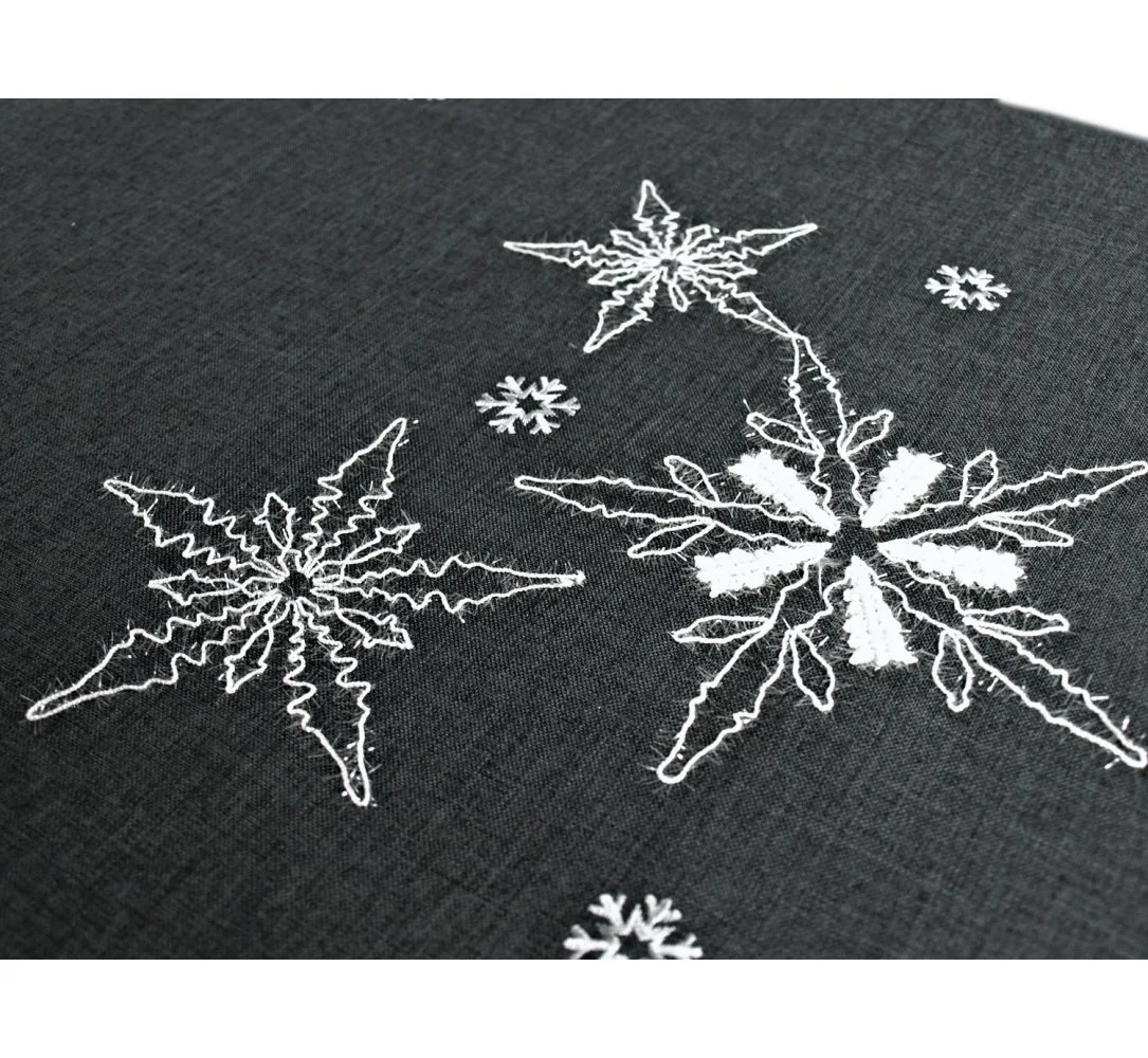 Aplikacja haftu na bieżniku świątecznym jest motyw białych gwiazdek, śnieżynek,to idealny dodatek do każdego wnętrza na specjalne okazje jakim jest okres Świat Bożego Narodzenia, będzie to doskonała dekoracja stołu, ławy lub stolików kawowych.