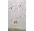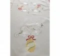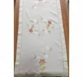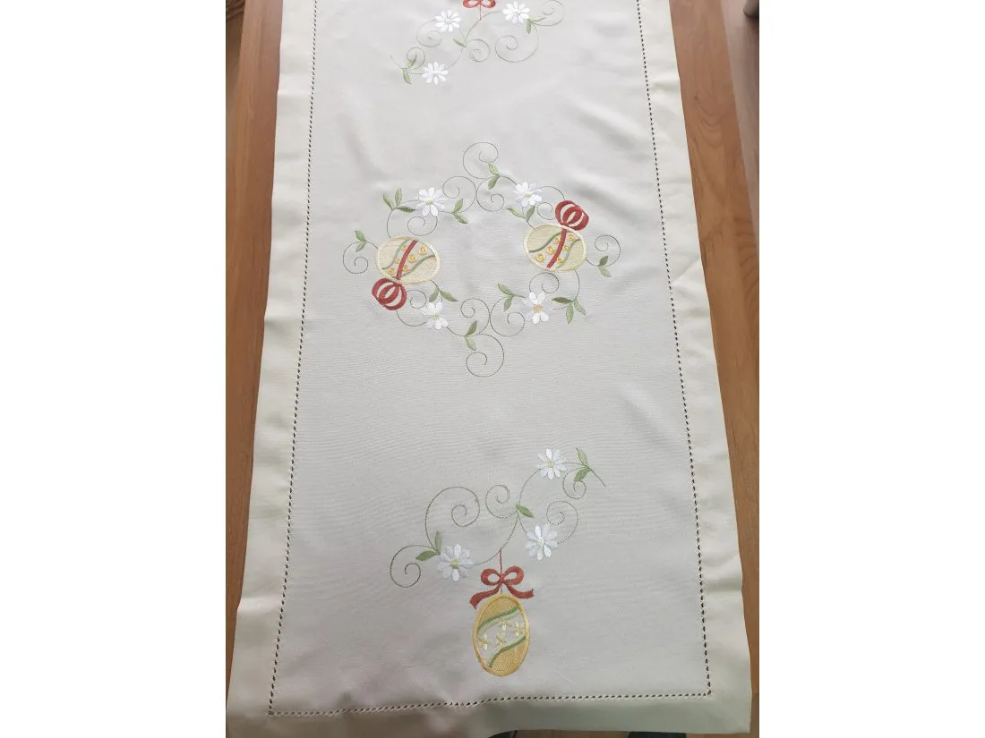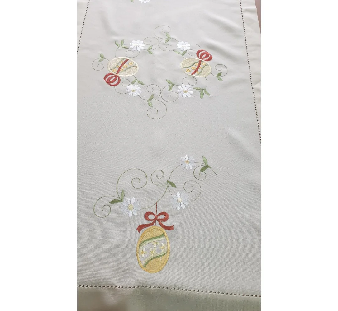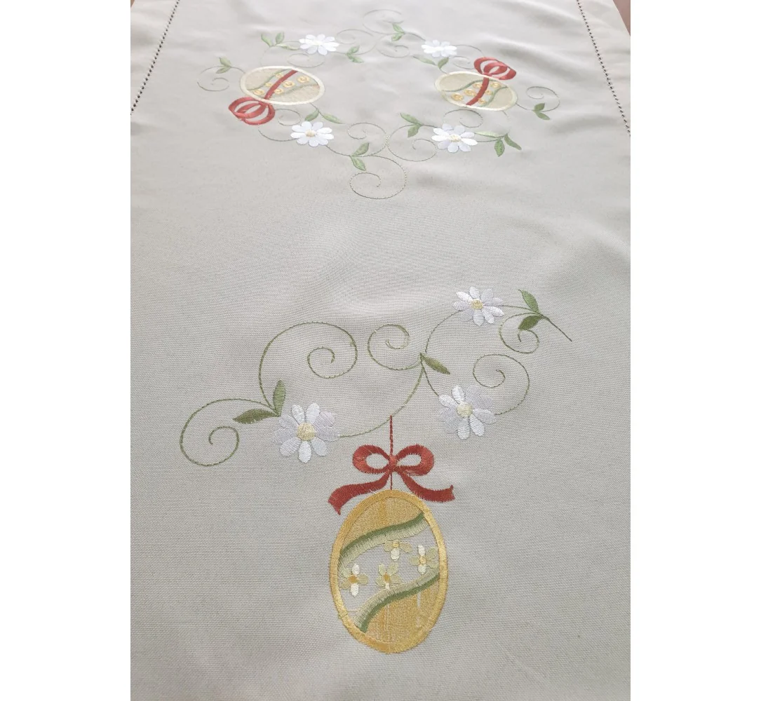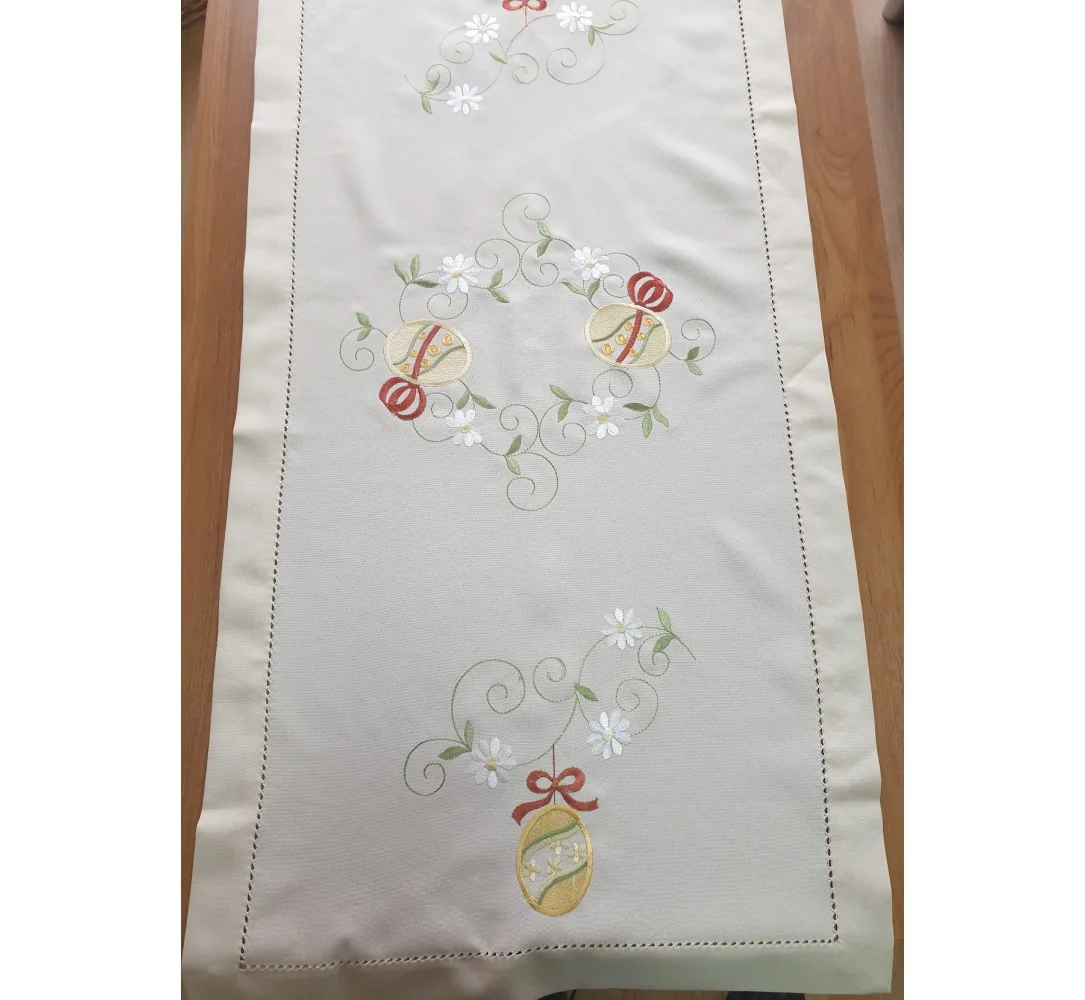 Bieżnik świąteczny w rozmiarze 60x120 cm w kolorze jasno beżowym z dekoracyjną aplikacją haftu kwiatuszków, pisanek, zakończony dekoracyjna mereżka.