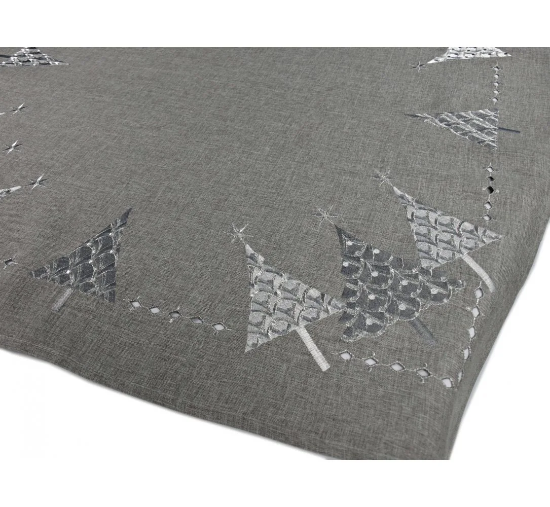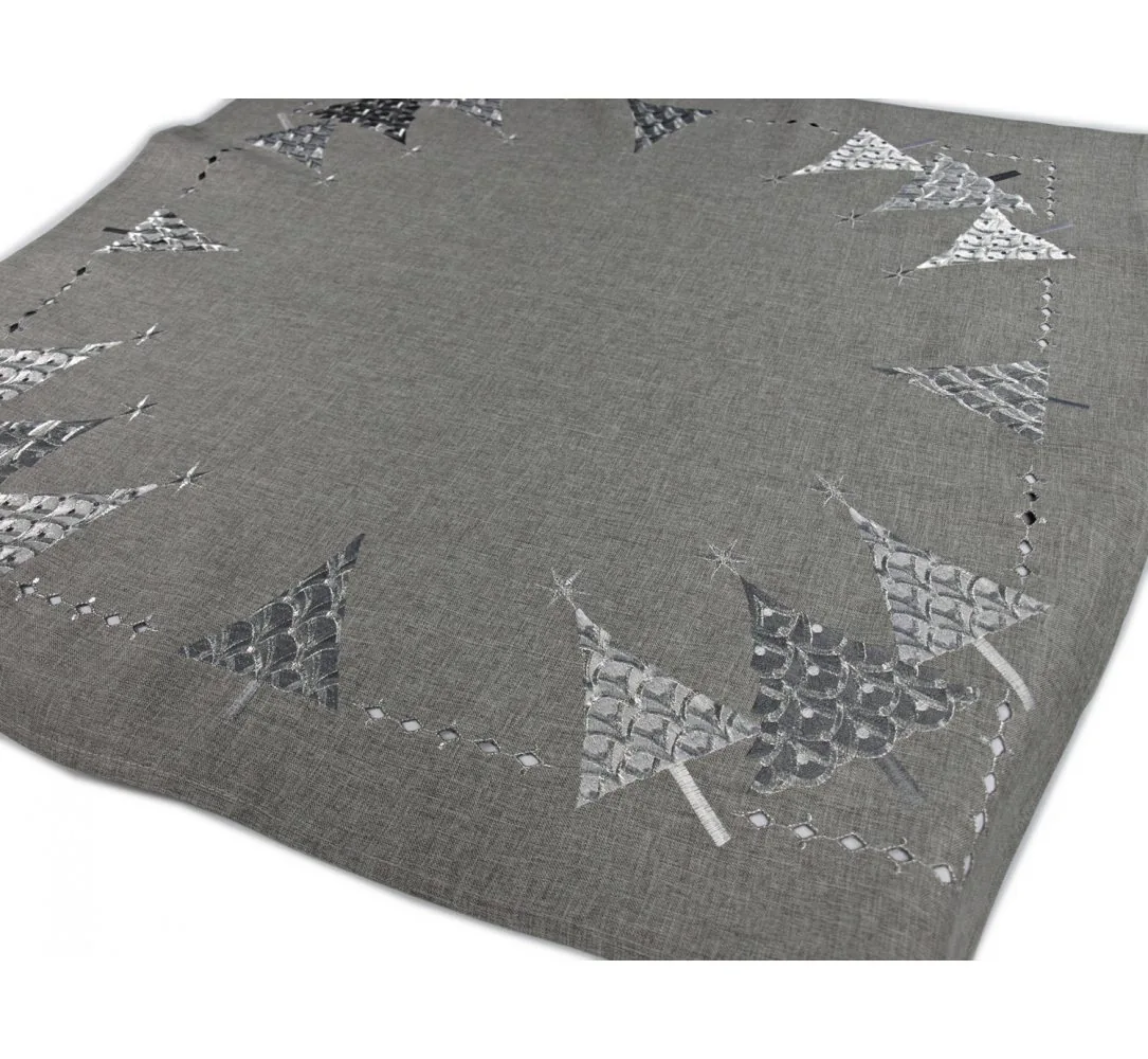 Nakładka świąteczna w rozmiarze 85 x 85 cm w kolorze szaro srebrnym z aplikacja haftowanej choinki w kolorze popielato szaro srebrnym.