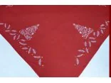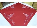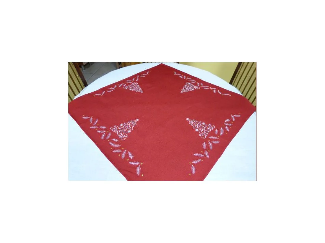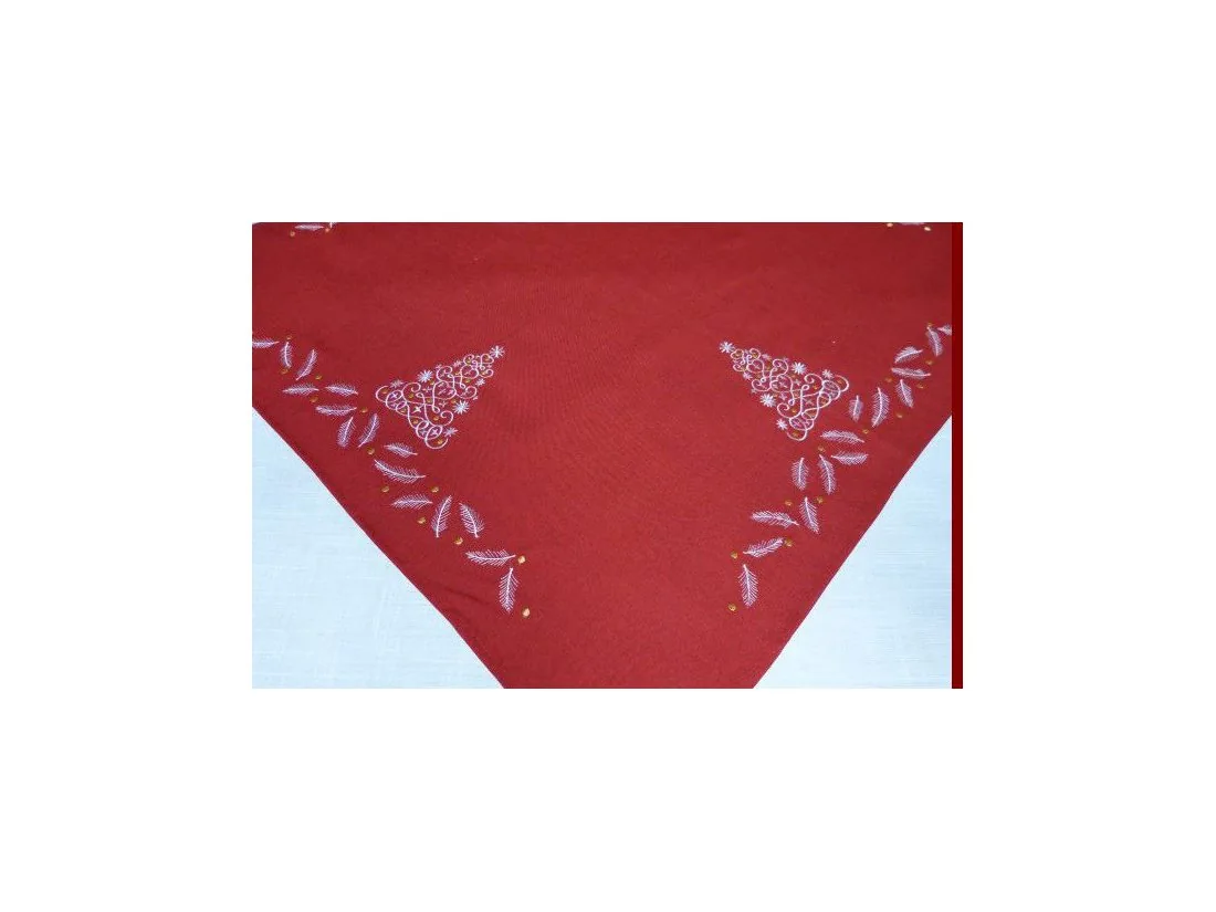 Bieżnik / nakładka świąteczna w rozmiarze 85x85 cm w kolorze czerwonym z dekoracyjną aplikacją haftu motywu choinki.