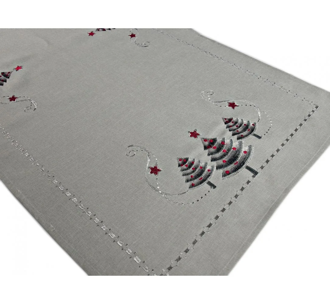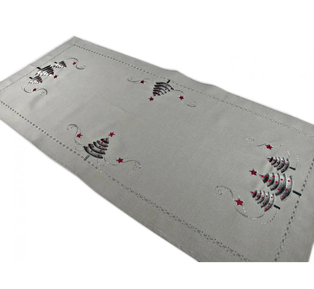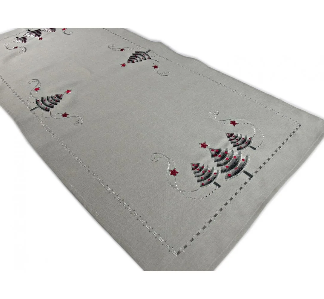 Nakładka świąteczna w rozmiarze 50 x 100 cm w kolorze szarym z aplikacja haftowanej choinki w kolorze srebrno grafitowym, dekoracyjny haft choinki oraz aplikacja wzorku na brzegach serwetki wykonany jest srebrną nitką.